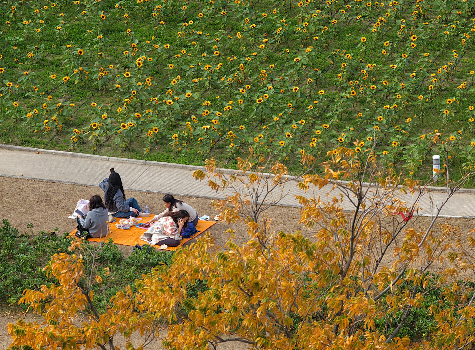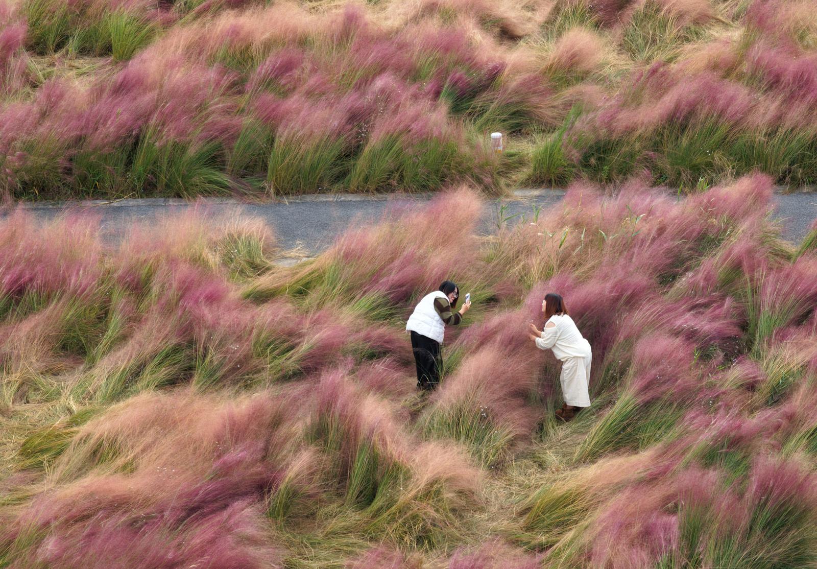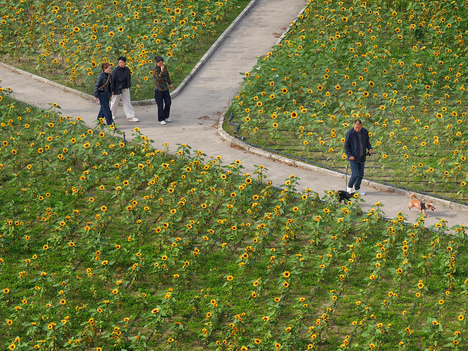 2025年11月12日,游客在崇川区滨江花海向日葵花丛中游览。眼下向日葵花陆续绽放,和粉黛乱子草相映成景,吸引了众多游客来到长江边畅游花海。