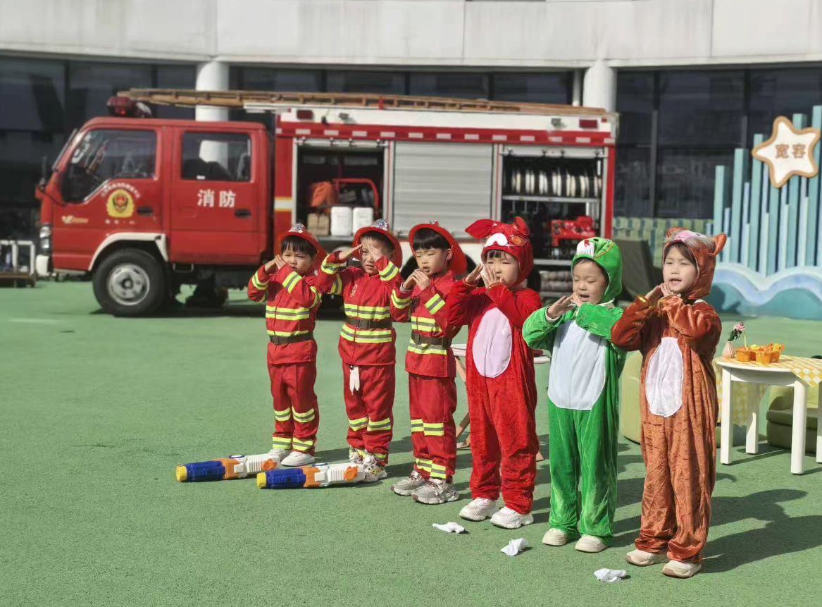 活动中,情景剧《消防安全我知道》模拟火灾场景,直观展现“弯腰逃生”“湿毛巾捂口鼻”等逃生技巧,集体舞《消防逃生安全操》将枯燥的安全知识转化为童趣动作,让孩子们在游戏、表演中掌握消防相关知识。在消防员指导下,孩子们还穿上消防服、参观消防车,体验一次“小小消防员”。