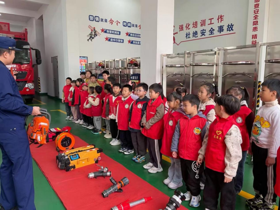 消防员叔叔们早已做好准备,以饱满的热情迎接孩子们的到来。一踏入消防站,整齐排列的消防车便吸引了孩子们的目光,大家纷纷围拢过来,眼中满是好奇与向往。在消防员的带领下,孩子们首先开启了“消防器材探索之旅”。消防员叔叔逐一展示了多功能消防水枪、消防指示灯、破拆工具等常用消防器材,用通俗易懂的语言讲解了各类器材的名称、用途和使用方法。“这是消防喷水枪,对准火焰根部喷射就能灭火”“这个是指示灯”,边讲解边示范操作要领,孩子们听得认真、看得专注,还踊跃举手提问,消防员叔叔都耐心地一一解答。部分勇敢的孩子还在消防员的指导下,亲手触摸、尝试操作简易消防器材,在实践中加深了对消防器材的认知。