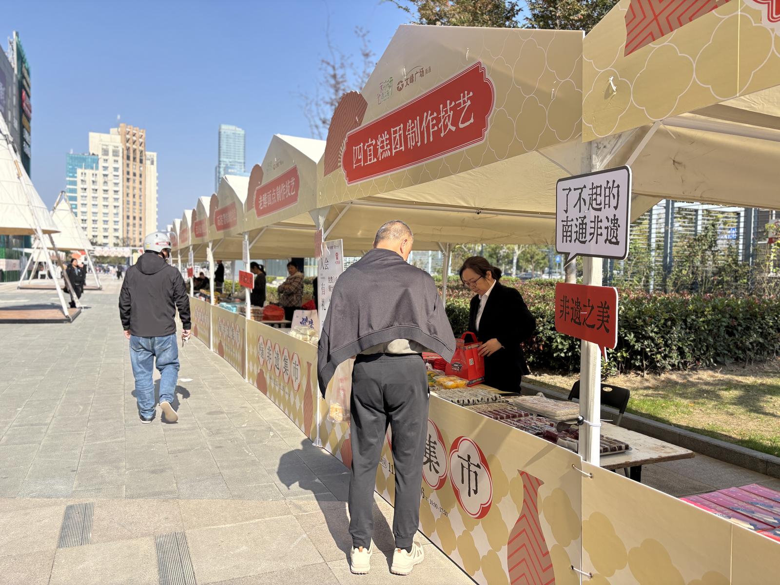市民朱先生边游览边品味,采购了新中腐乳、石港窨糕等特产。他说:“在家门口就能买到非遗美食、欣赏到非遗精品,参与这么丰富的文化活动,非常开心。”