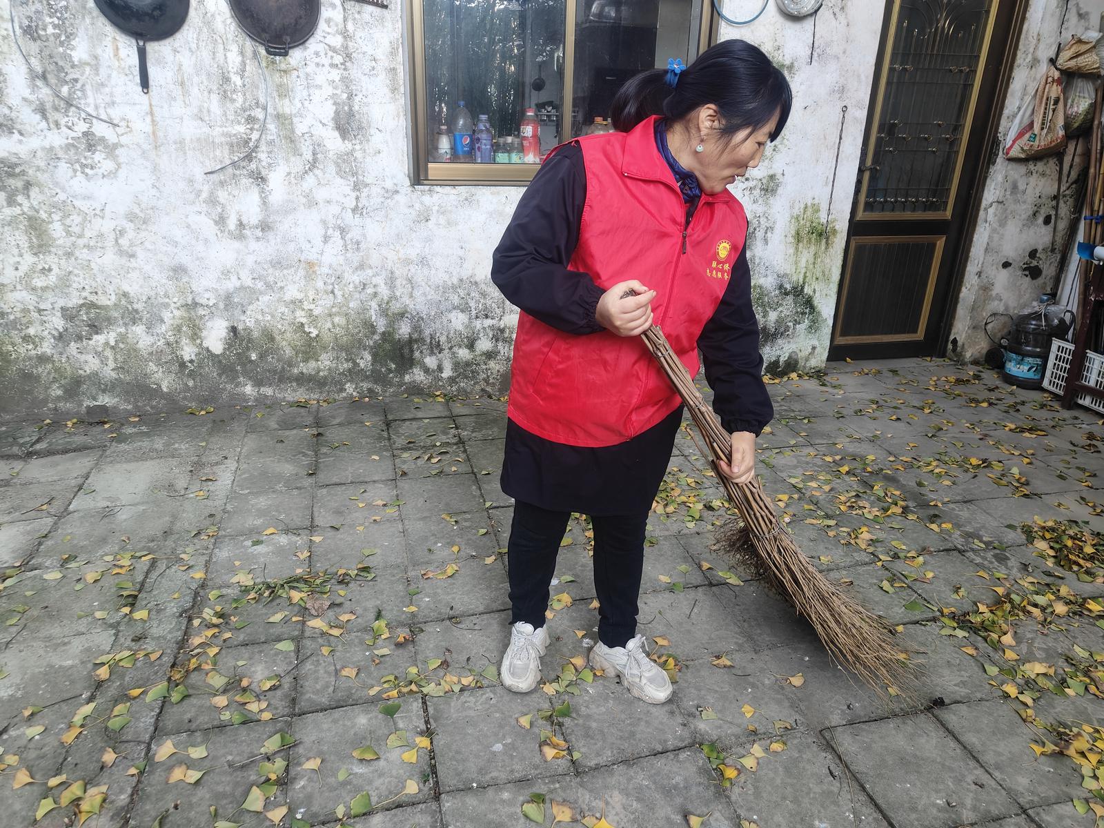 活动当天,志愿者带着清扫工具和精心准备的牛奶、坚果、饼干等慰问品,走访子女长期在海外居住的侨眷家庭。看到侨眷院落里堆积的落叶和杂物,志愿者立刻行动起来,他们分工协作,配合默契,有的挥动扫帚清扫落叶,有的清理角落的垃圾杂物,有的帮忙整理柴火堆。寒风虽然凛冽,但大家的劳动热情高涨,忙碌的“红马甲”身影成了冬日里一道温暖的风景。经过一番辛勤劳作,原本略显凌乱的庭院变得干净整洁、井井有条。