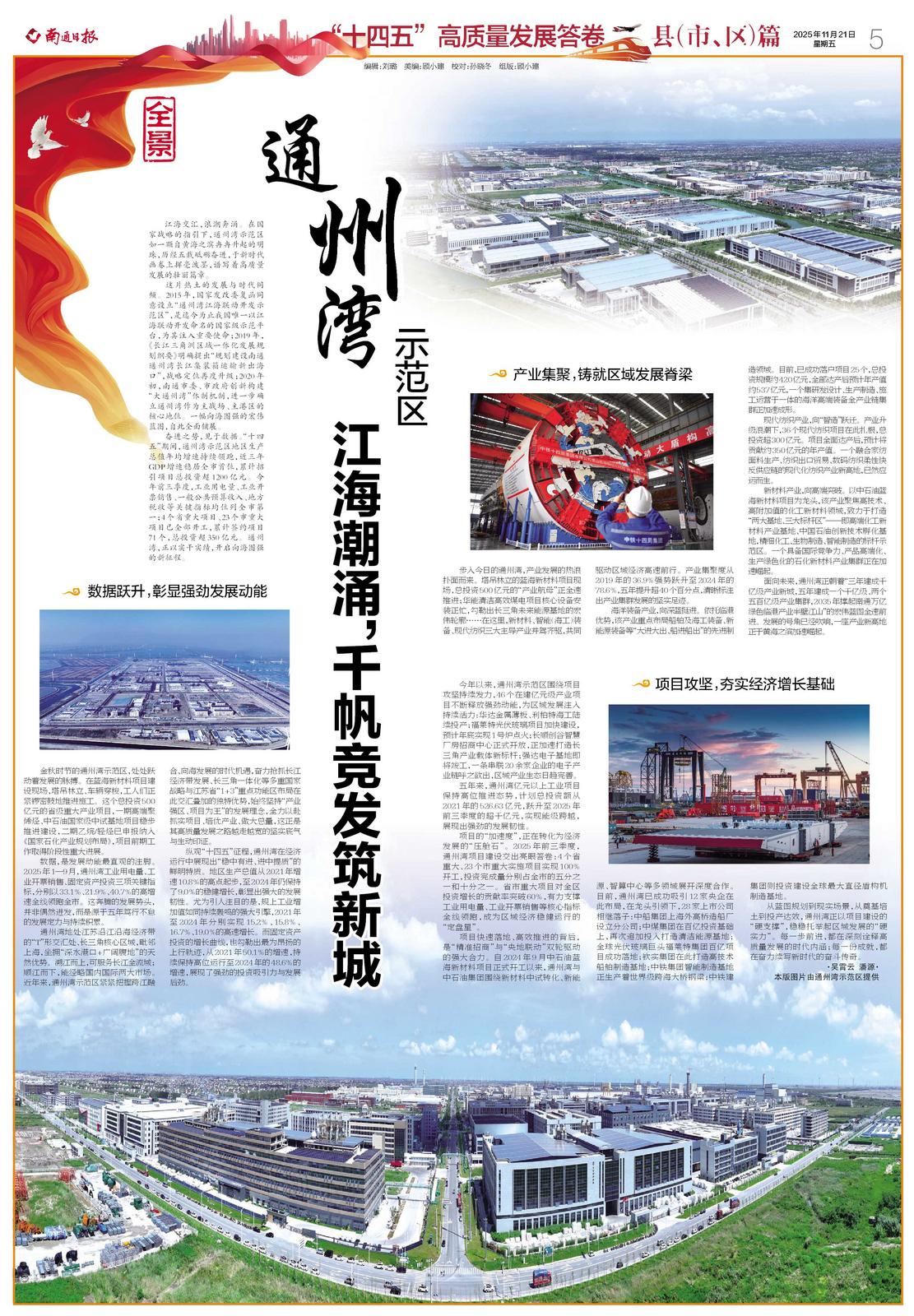 奋进之势,见于数据。“十四五”期间,通州湾示范区地区生产总值年均增速持续领跑,近三年GDP增速稳居全市首位,累计招引项目总投资超1200亿元。今年前三季度,工业用电量、工业开票销售、一般公共预算收入、地方税收等关键指标均位列全市第一;4个省重大项目、23个市重大项目已全部开工,累计签约项目71个,总投资超350亿元。通州湾,正以实干实绩,开启向海图强的新征程。