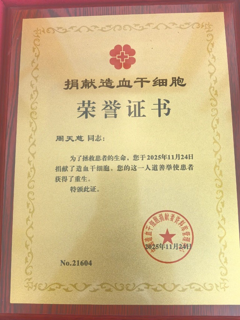 2023年的一天,周天慈像往常一样走进献血车,挽起衣袖捐献热血。采血过程中,工作人员向他介绍了造血干细胞捐献的相关知识——这是目前治愈白血病、再生障碍性贫血等血液病的关键手段。“当时就被‘生命匹配’这四个字触动了。”周天慈回忆道。他回去连夜查阅资料,了解到捐献过程安全规范,对身体无害,却能为患者带来治愈的可能。辗转思考间,一份沉甸甸的责任感在心底升腾。随后他又赶到献血车上,坚定地要求入库。
