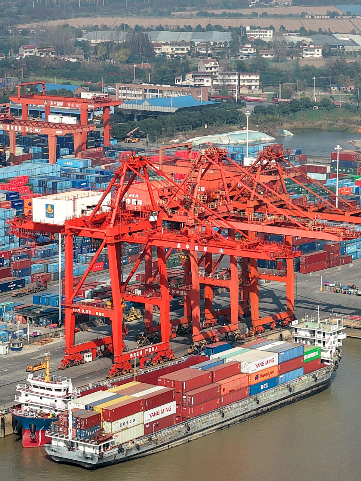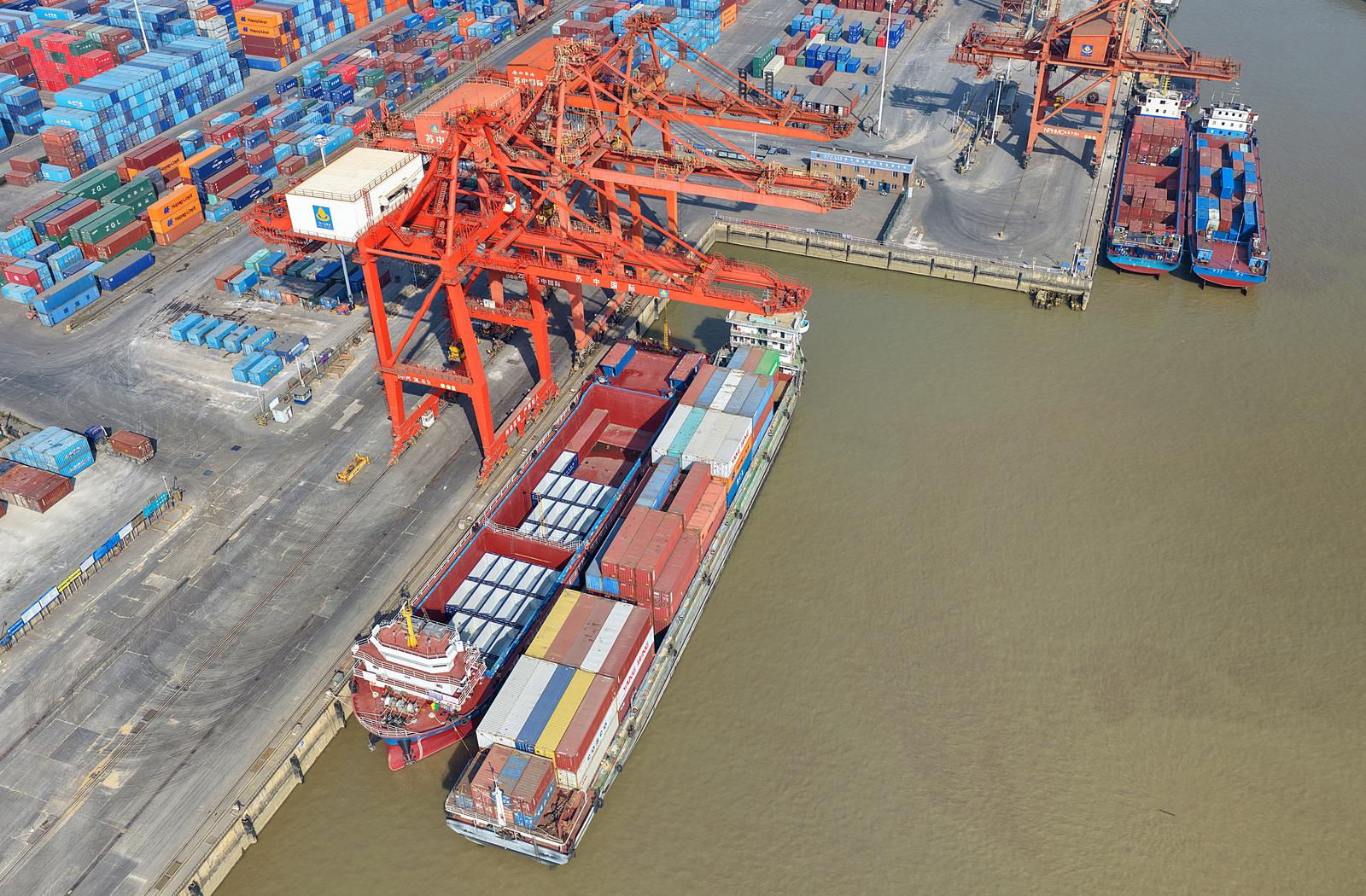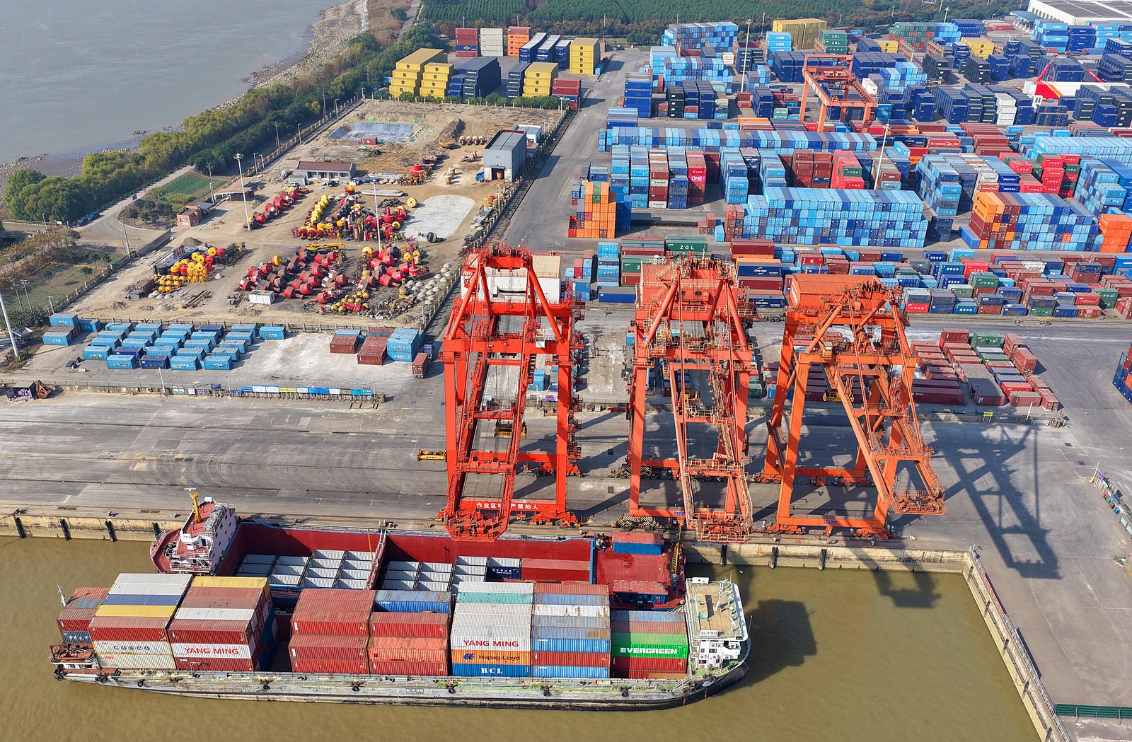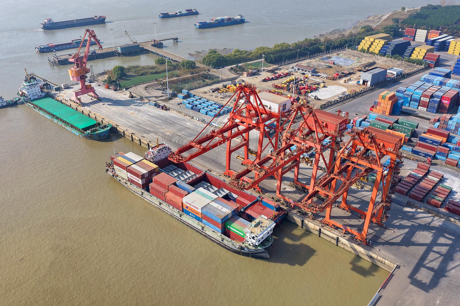 2025年11月24日在如皋市长江镇拍摄的忙碌的如皋港苏中国际集装箱码头和堆场。今年前10月,如皋港货物吞吐量实现6414.99万吨,集装箱吞吐量达53.76万标箱。据悉,随着上月“如皋—美国新奥尔良”直航新航线正式开通,如皋港累计开辟中外航线43条,“码头+保税+仓储+贸易+物流+供应链”的完整港口生态链初步成型。