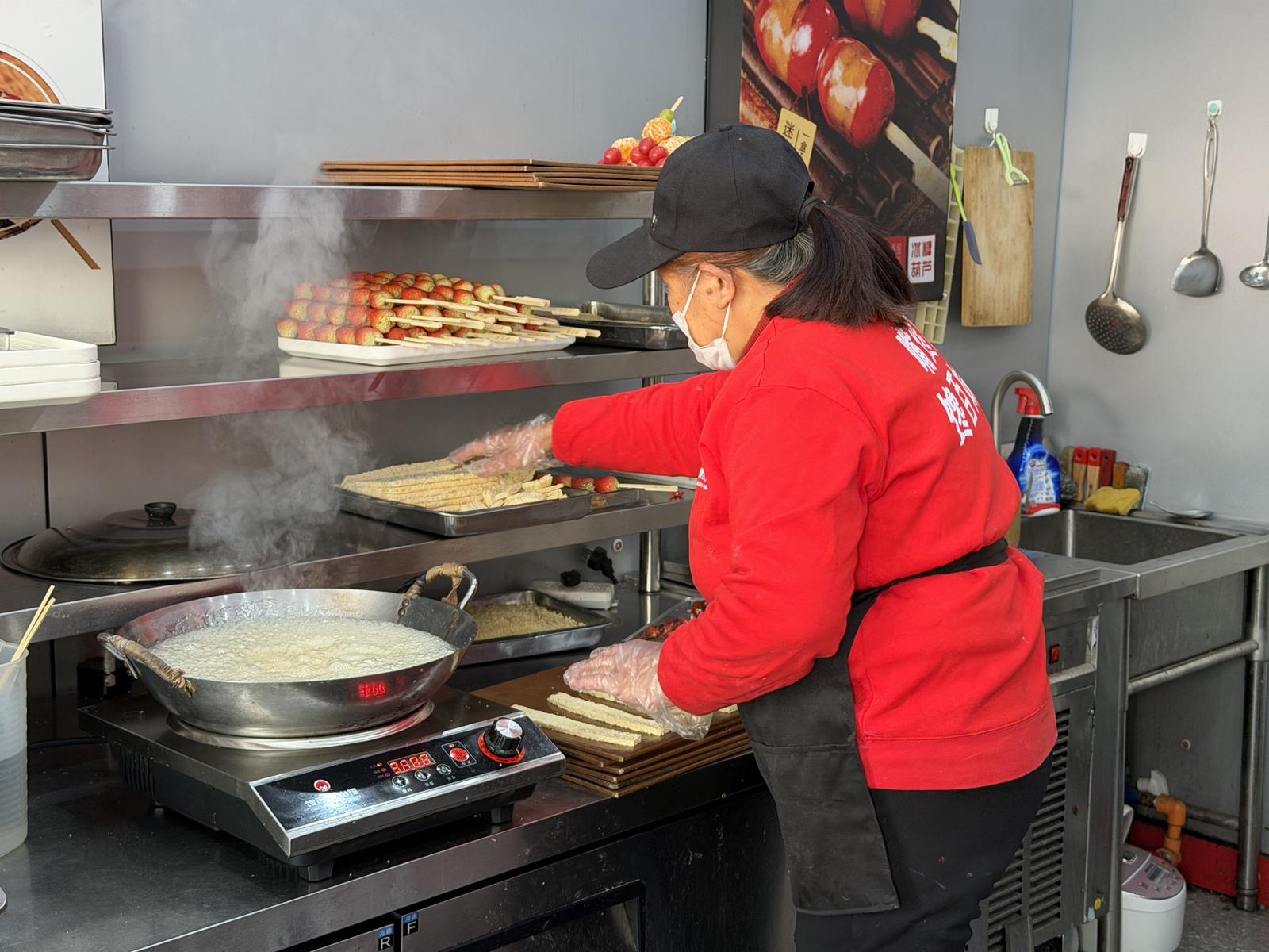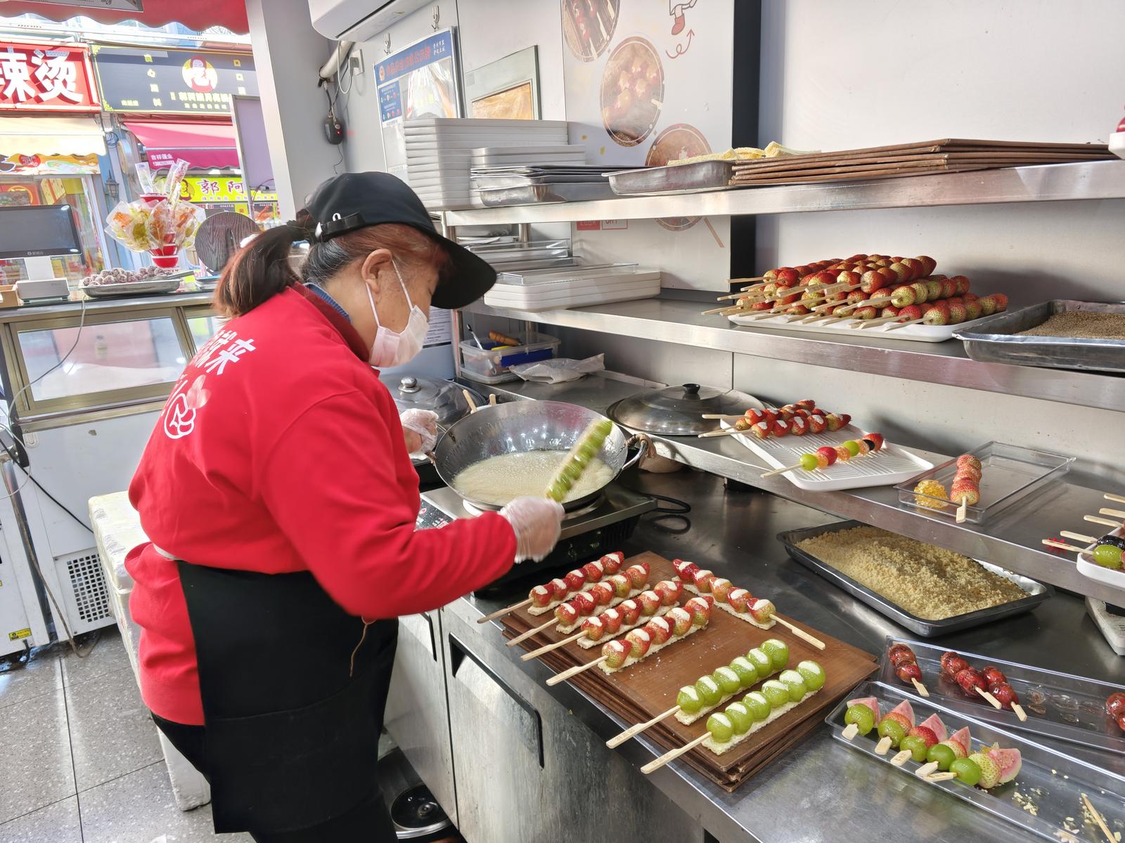 店主朱文娟正在制作奶皮子糖葫芦。“这款糖葫芦前段时间火得不得了。”朱文娟一边忙一边说,“有一阵从早做到晚,做多少卖多少,经常有人排长队还买不到,第二天专门赶早等候,确实供不应求。”她表示,购买者以年轻人为主,多是被网络热度吸引前来尝鲜。在11月初的销售高峰时段,她的门店一天能卖出几百串。