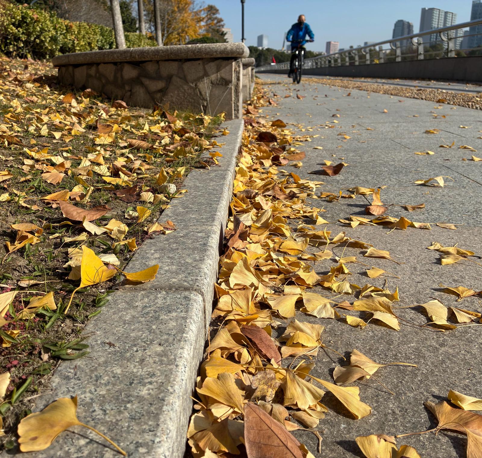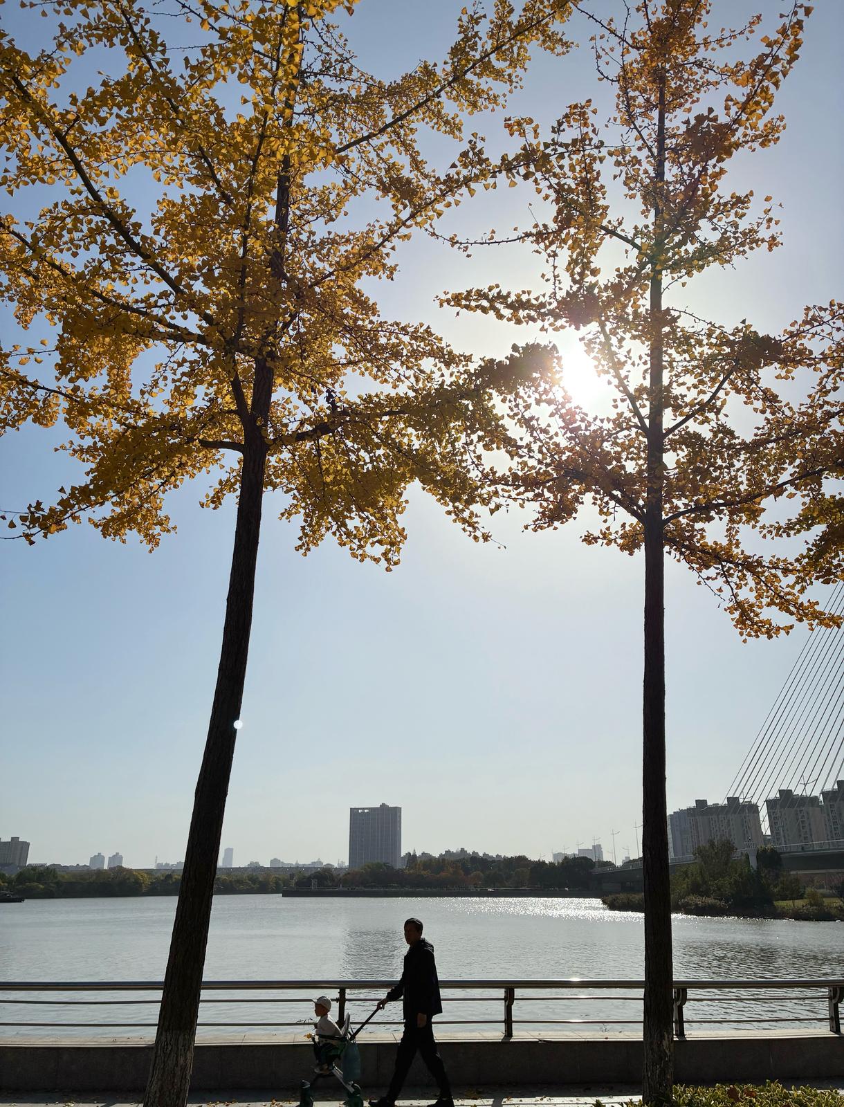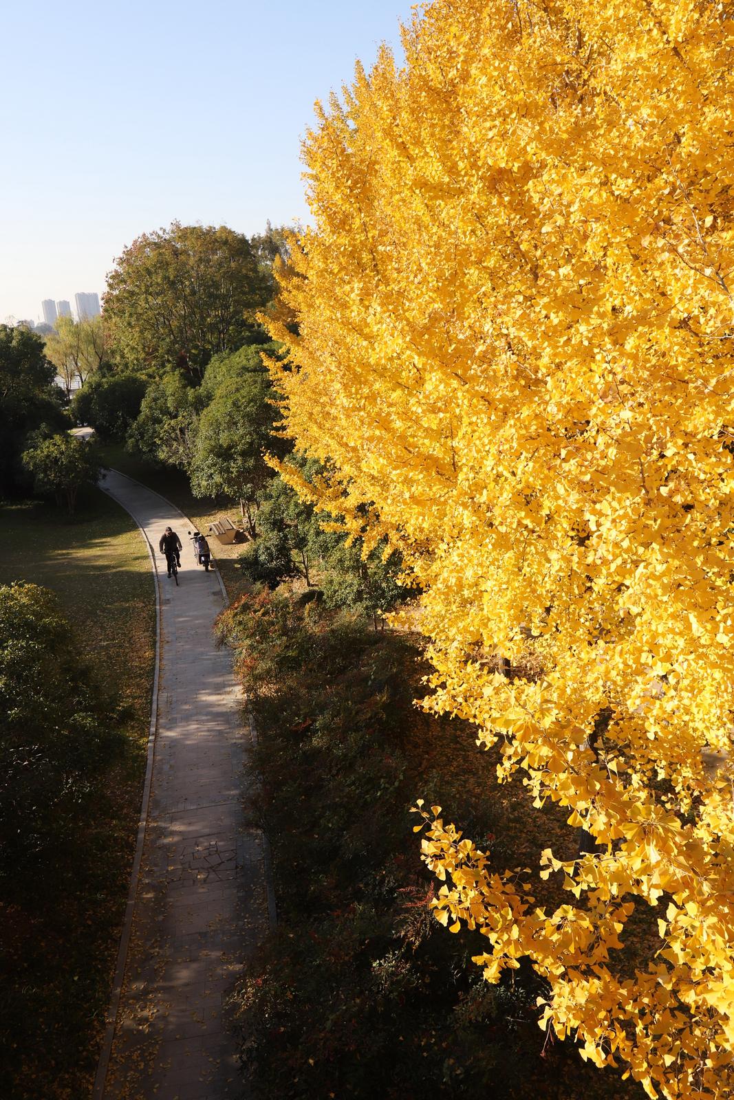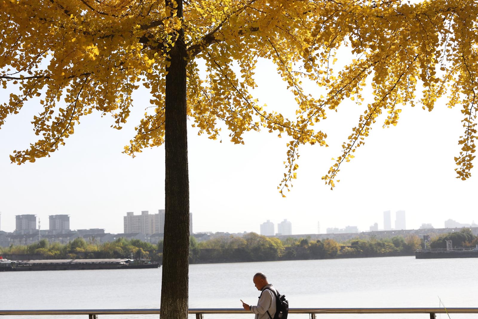 市民游客们三五成群驻足赏景,用镜头定格下这绚烂的美景。“和天空相映衬,这种金黄色真的太美了,非常秋天。”市民陆女士说,“无论是散步还是骑车经过这里,心情都会变好。”
