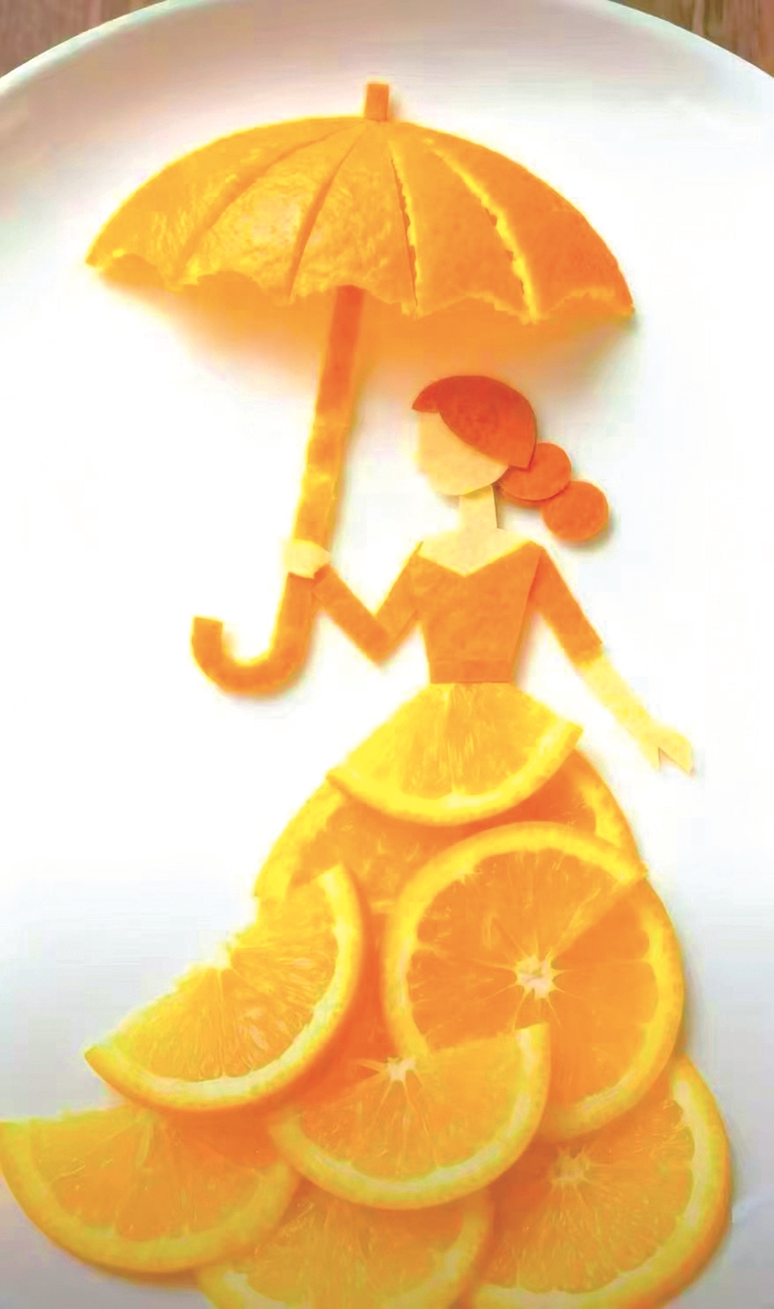 浅棕色的果皮剪裁成V领上衣和精致发髻,橙黄色果肉切成均匀薄片,层层叠叠铺展成蓬松的伞裙。半透明的果肉在阳光下泛着晶莹的光泽。少女手持一柄小伞,纤细的伞柄与舒展的左臂形成优美平衡,仿佛“柑橘”少女正提着裙角在餐盘上轻盈旋转。