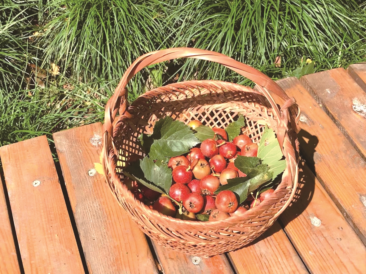 我夸爷叔有腔调,还懂得在竹篮里放几片绿叶衬托红果。确实,有了绿叶的衬托,山楂果红得更可爱了。