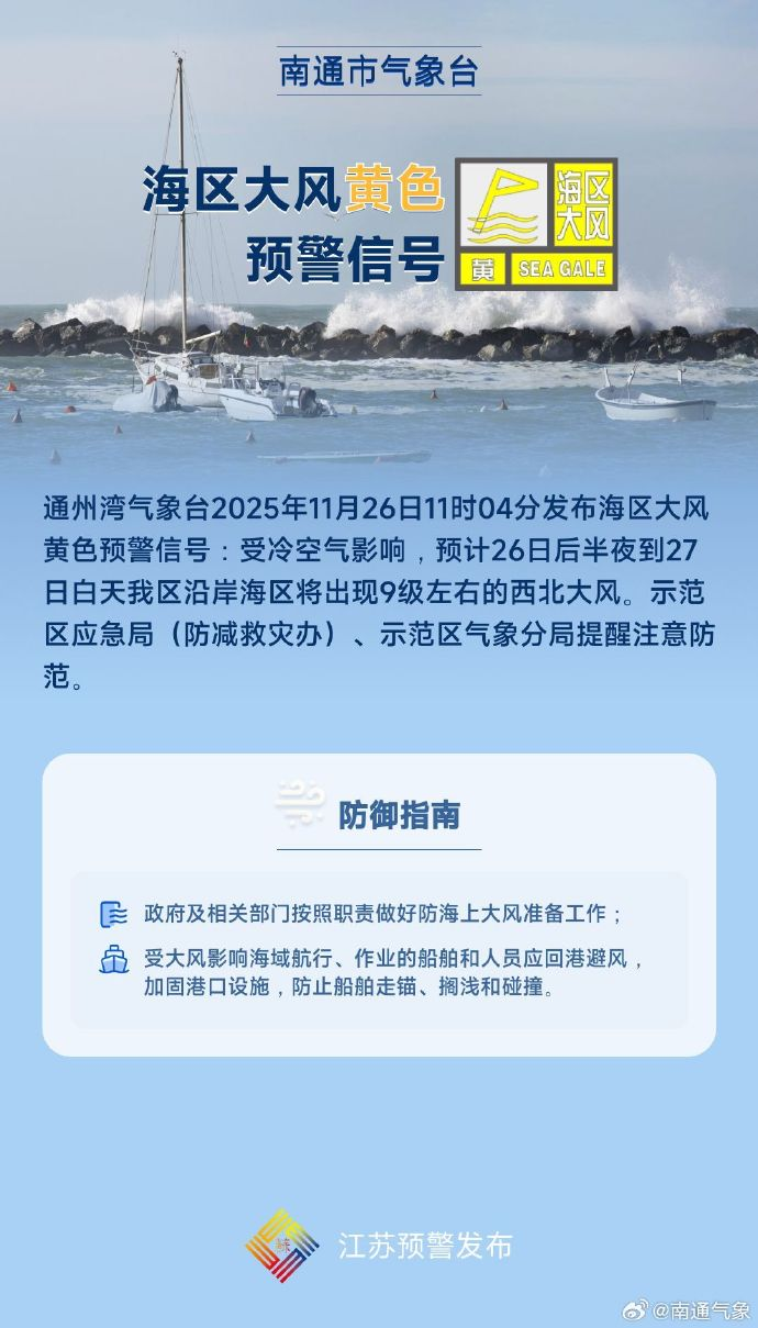 今天,市气象台先后发布海区大风黄色预警信号和大风蓝色预警信号。受冷空气影响,预计26日后半夜到27日白天我市沿岸海区将出现9~10级的西北大风。陆上风力同样强劲,我市海安、如东、海门、启东、通州湾的部分乡镇(街道)将出现8级左右的西北大风,其他地区最大阵风7级左右。此次冷空气影响过程中,降温与大风相伴,“风寒效应”显著,体感温度会比实际气温更低。市民外出时将感到寒意明显,早晚时段尤其要注意防风保暖。值得注意的是,受夜间晴空辐射影响,28日早晨最低气温预计将跌破冰点,降至-1℃左右,创今年下半年以来气温新低。