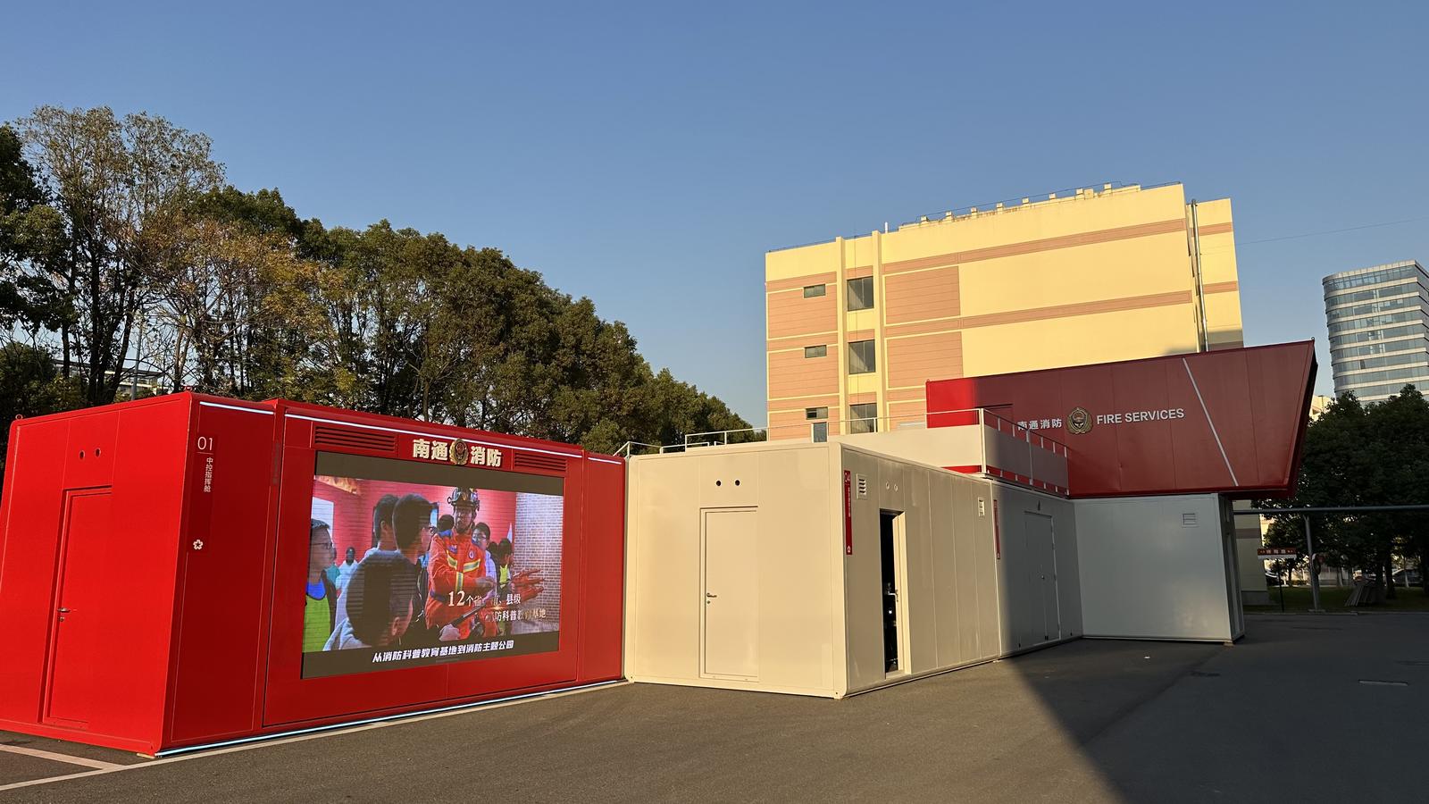 在江苏省海门实验学校内有一处由10个红白相间的方舱组成的造型独特的消防科普基地,全称为“南通消防安全科普教育智能方舱”,这是一处集科技性、互动性、教育性于一体的现代化消防安全科普教育基地,是南通消防创新消防安全培训模式的一项重要成果。