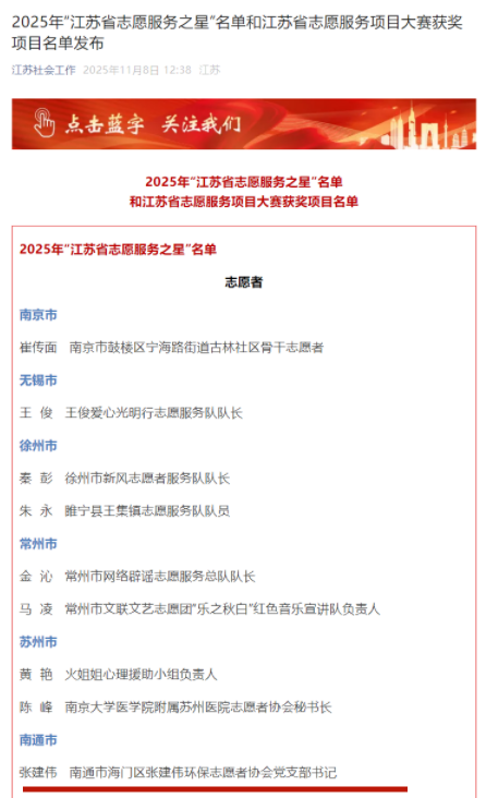 “做一粒燎原的星火”——这是张建伟践行的人生信念。作为一名有着30多年党龄的老党员,他始终不忘初心。他的奉献精神也获得了社会的广泛认可,先后被评为中国好人、江苏省优秀志愿者、“江苏好人”、全国最美生态环保志愿者。