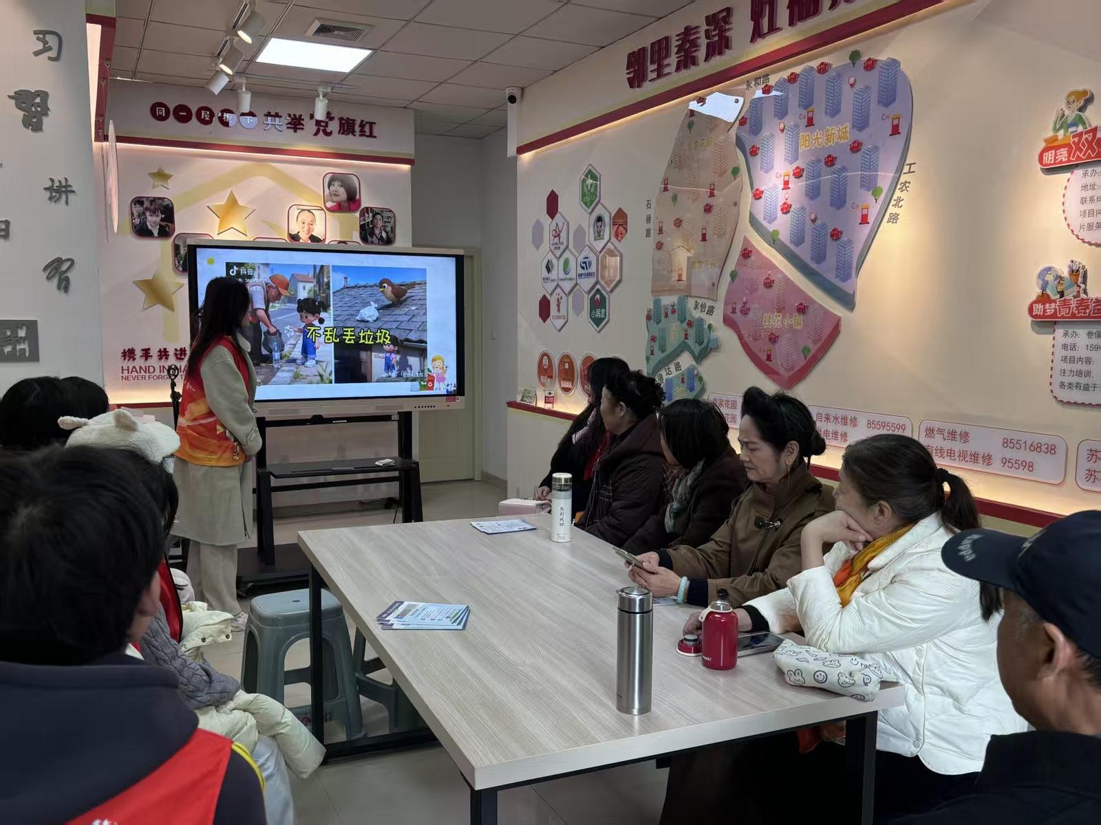 活动中,团队成员分为“室内宣讲组”与“户外实践组”。室内宣讲在社区党群服务中心开展,成员围绕“垃圾分类与康养环境的关系”“垃圾处理现状”“四类垃圾区分方法”等内容,结合动画演示与问答互动,重点向社区老人及青少年代表讲解分类意义与实操技巧,“废旧电池单独投放”“牛奶盒压扁再回收”等贴近生活的案例,让居民尤其是老年群体听得入心,现场氛围热烈。