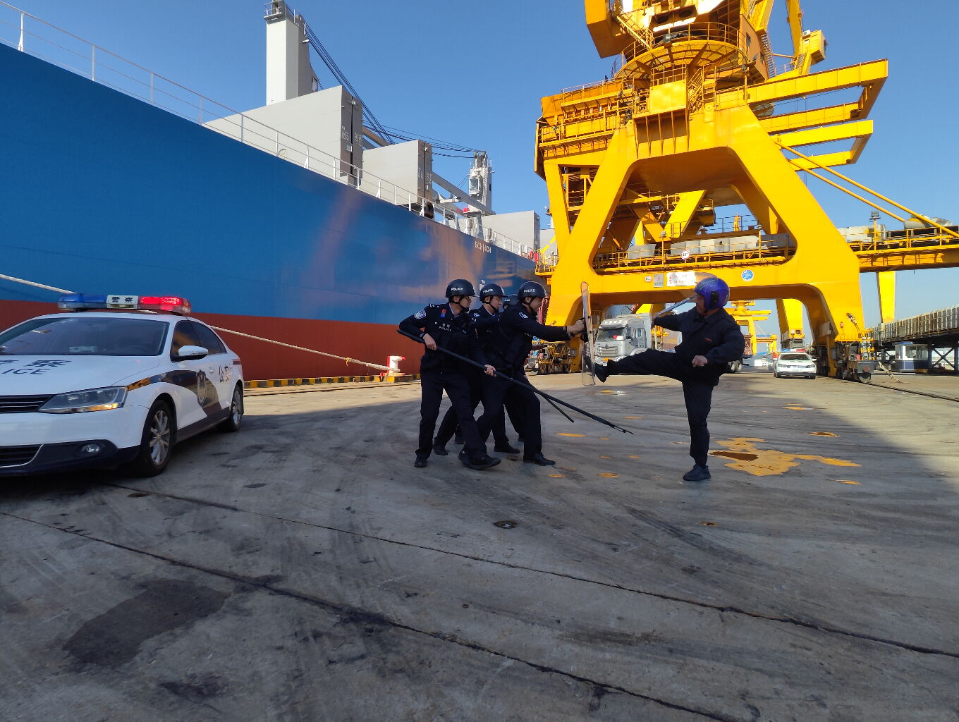 此次演练模拟执勤民警在口岸限定区域内发现可疑人员徘徊逗留,拒不配合检查,试图扰乱口岸限定区域秩序。演练中,各小组反应迅速、分工明确、熟练处置,在可疑人员不听劝阻、行为升级后,妥善将其带离现场,恢复了码头正常作业秩序。