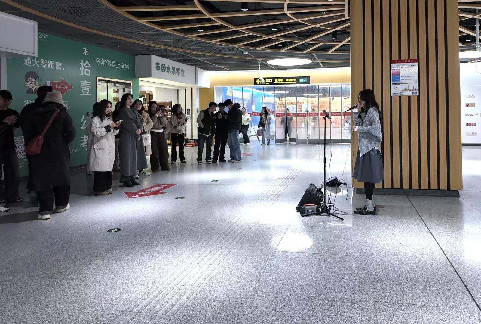 “刚下课准备回家,就被歌声留住了!”南通大学大三学生王同学举着手机记录,跟着《慢慢喜欢你》的节奏轻轻哼唱。通道内,越来越多市民驻足围观,有人踮脚拍照,有人跟着旋律摇摆,原本喧闹的通勤通道,此刻变成了充满温情的“移动音乐厅”。《平凡之路》的坚定唱腔、《我怀念的》的深情演绎,一首首耳熟能详的歌曲接连唱响,温暖的音符穿透初冬的寒意,让现场气氛持续升温。