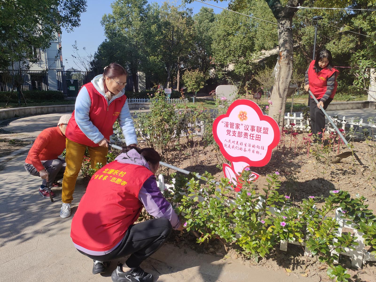 初冬暖阳洒满大地,11月28日中午,崇川区和平桥街道北濠桥东村小区的康养花园里,日日春依旧娇艳,月季已悄然敛起芳华。“濠管家”议事联盟的志愿者相约而来,俯身为新栽的杜鹃松土、浇水。“有了这杜鹃,等到明年春天,这里一定更美!”欢声笑语中,承载着大家对家园未来的美好期许。