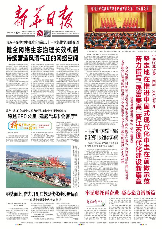 11月28日至29日,省委十四届十次全会在南京召开。会议深入学习贯彻党的二十届四中全会精神和习近平总书记对江苏工作重要讲话精神,审议通过《中共江苏省委关于制定江苏省国民经济和社会发展第十五个五年规划的建议》。