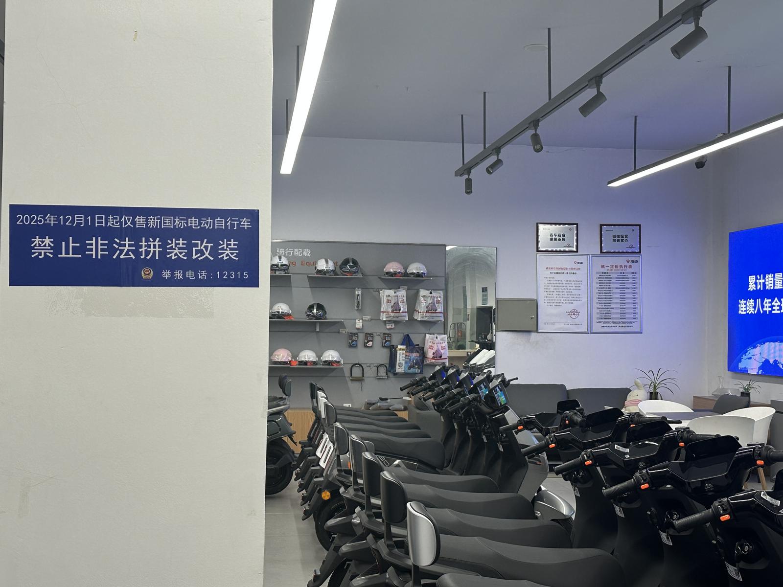 专卖店墙面上张贴着“12月1日起仅售新国标电动自行车”的标识。
