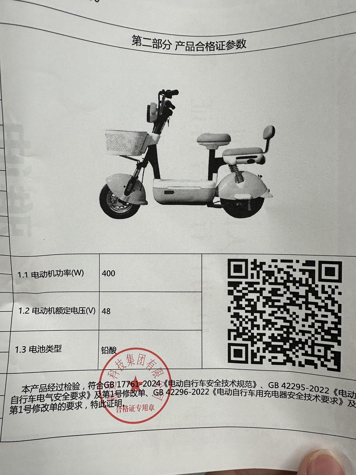 从外观上看,这款电动自行车与旧国标电动自行车没有明显区别,推、骑行也比较轻便灵活。而翻开产品合格证,上面则标有“本产品经过检验,符合GB17761-2024《电动自行车安全技术规范》”等内容,从而验证了该车是按照新国标生产的。
