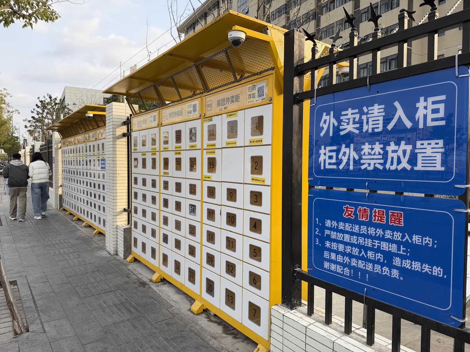 值得注意的是,校方还在智能外卖柜旁设置蓝色提示板,醒目的白色字体提醒外卖骑手须将餐食放入柜内,严禁放置或吊挂在围墙上;未按要求放入柜内造成损失的,由此产生的后果由外卖配送员负责。