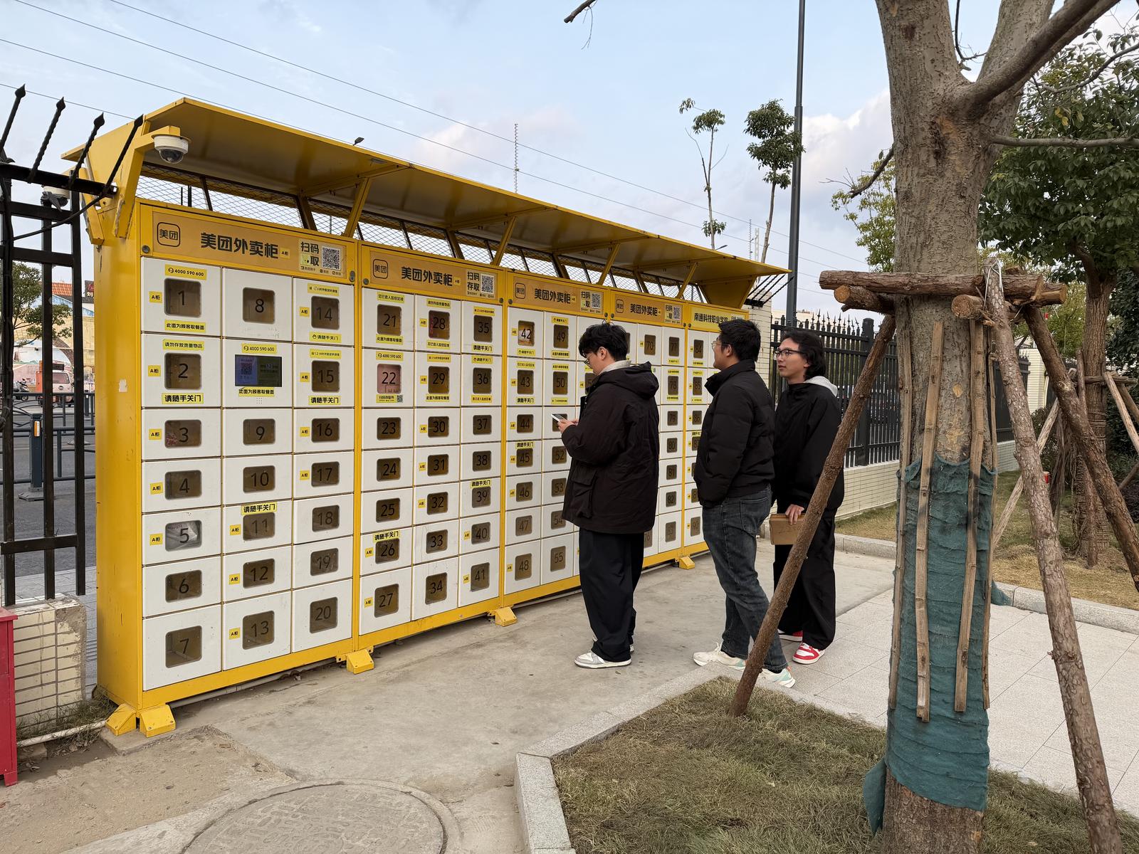 外卖储存柜取代了部分原有的黑色栅栏,共设8组、166个格口,每个格口均采用双向柜门,一面紧邻青年中路,方便外卖骑手投放餐品;另一面朝向校内,方便学生自助取餐。