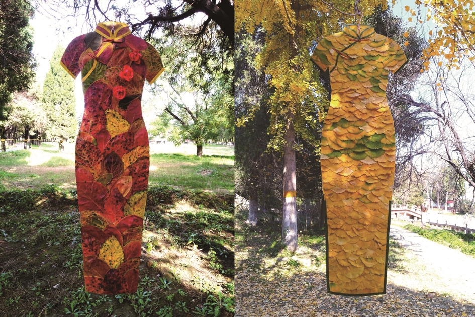 初冬的落叶很美,而用落叶做的旗袍更美,用这种方式留住落叶之美,是一件很惬意,也很有意思的事。