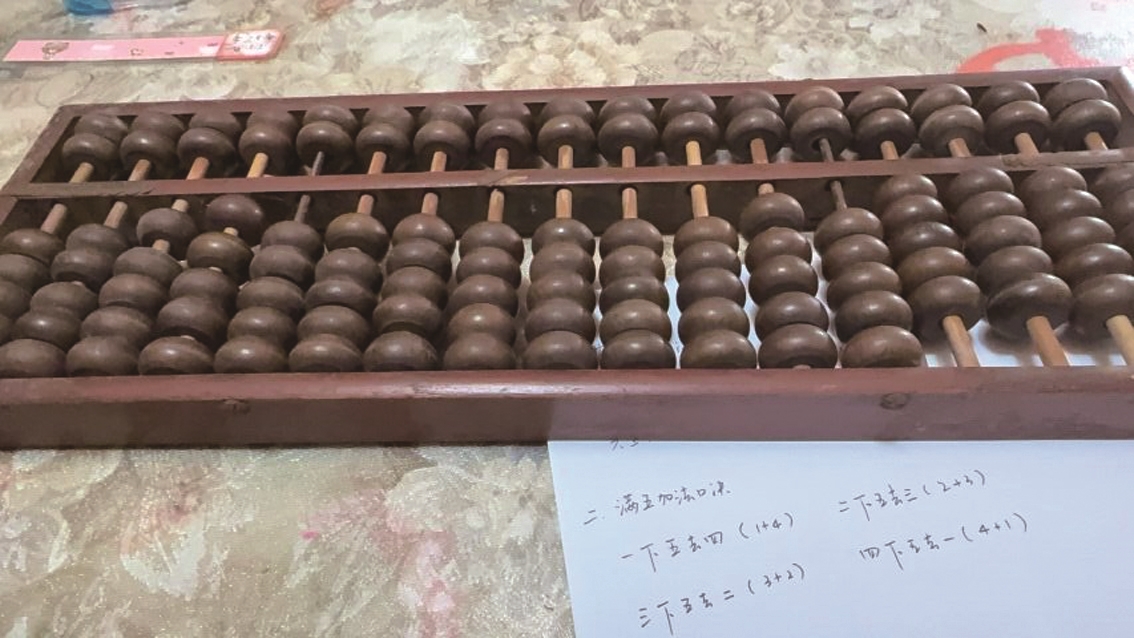 女儿要“玩”,我当然要教。计划先教加法,我把女儿和儿子一起叫过来,把加法的四种口诀——“基础加法口诀”“满五加法口诀”“进位加法口诀”“破五进位加法口诀”解读给他们听,并在算盘上一一演示,加以实例让他们来实际操作。他们感到很新鲜,像在玩一个玩具一样。不到两小时的时间,他们一边玩,一边会加法运算了。“妈妈,算盘真有意思。”“古人真有智慧。”