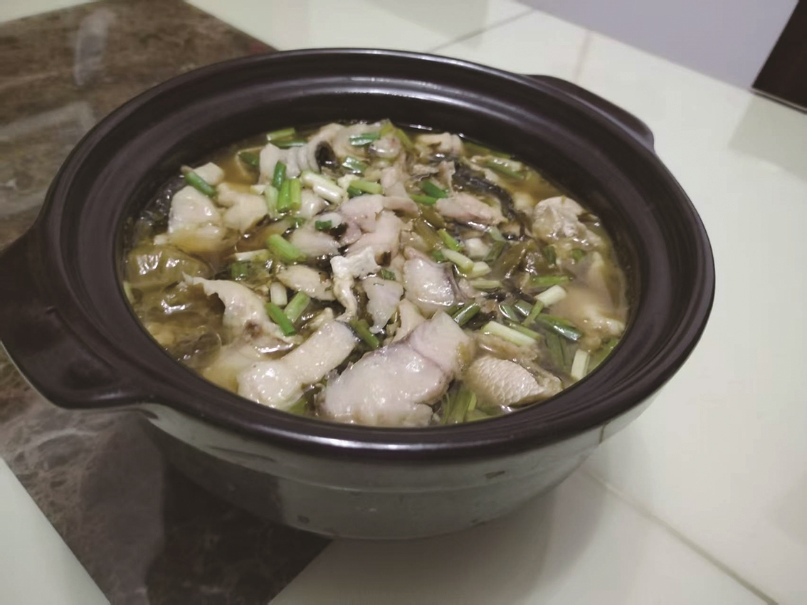 清晨的第一缕阳光刚刚爬上窗棂,我便去菜市场买了条野生黑鱼。首先,切鱼片。刮去鱼鳞,剖肚洗净,银亮的刀刃贴着鱼中骨游走,鱼身随着刀锋被切成两块鱼身肉,再斜刀切成薄片,像透光的玉片,洗净沥干,加入盐、白胡椒粉、料酒、淀粉、鸡蛋清抓拌均匀,渐渐泛起珍珠般的光泽,腌制约10分钟。随后,炒底料。热油中放入鱼骨翻炒至焦香后,倒入葱姜蒜、干辣椒和切碎洗净的酸菜,炒至爆香,再倒入开水,加入白醋,大火约煮5分钟,汤色渐渐熬成牛乳般的醇白。
