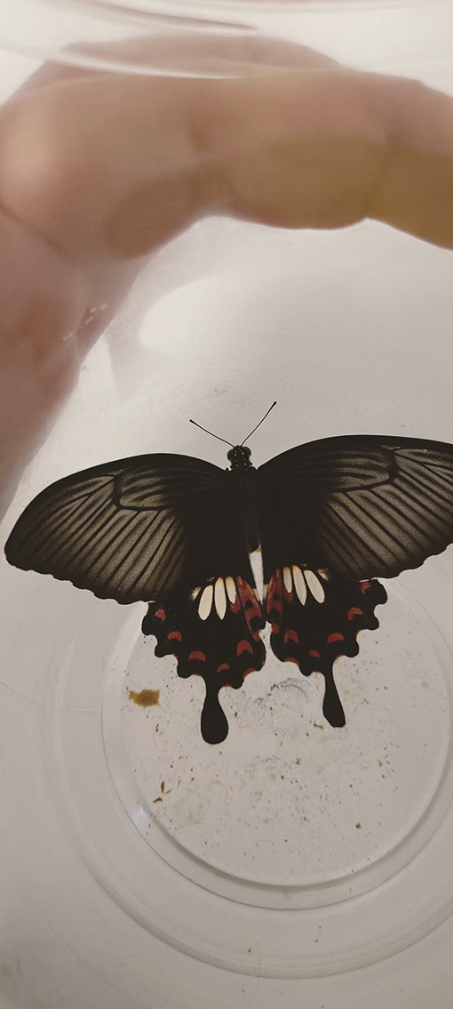 微信叮咚一响,天天发来一张黑蝴蝶的照片,后翅边缘还缀着深红色的花纹,美得让人屏息。她说:“是毛毛虫变的。”