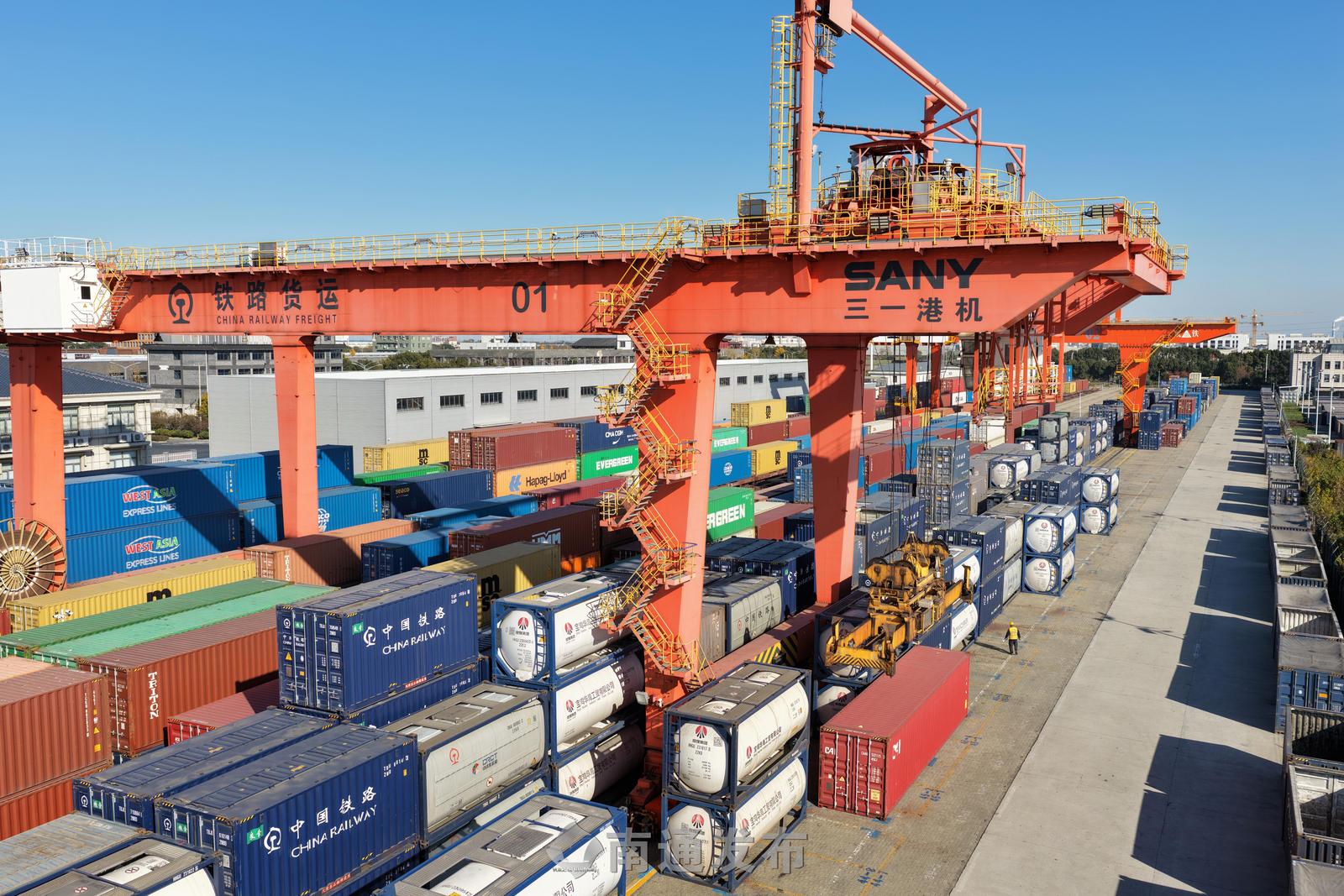 2025年12月3日在位于海安商贸物流园的中国铁路上海局集团海安物流基地拍摄的忙碌装运集装箱的画面。据统计,今年由海安商贸物流园铁路物流基地发送至上海港、宁波港海铁快线班列812列,发送货物7.5万标箱,同比增长5%。