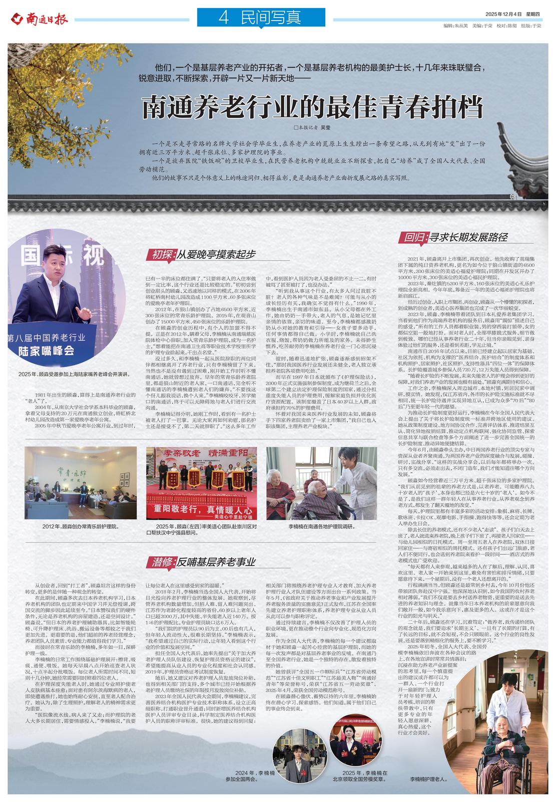作为全国人大代表,李楠楠的每一个建议都取材于她和顾淼一起苦心经营的基层护理院,而她的每一次发声都是对基层养老事业的反哺。在南通乃至全国养老行业,她是一个独特的存在,散发着独特的价值。