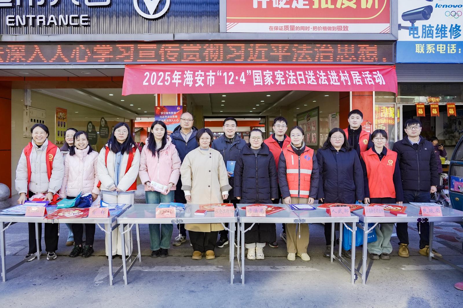 在全国法制宣传日到来之际,海安市滨海新区角斜社区联合滨海新区司法所、市场监管局滨海新区分局等多个职能部门,在角斜社区好润多超市门前广场共同举办了一场主题鲜明、内容丰富的“送法进村居”普法宣传活动。活动旨在将法律知识和法治服务直接送达群众身边,切实提升基层群众的法治素养和依法维权能力。
