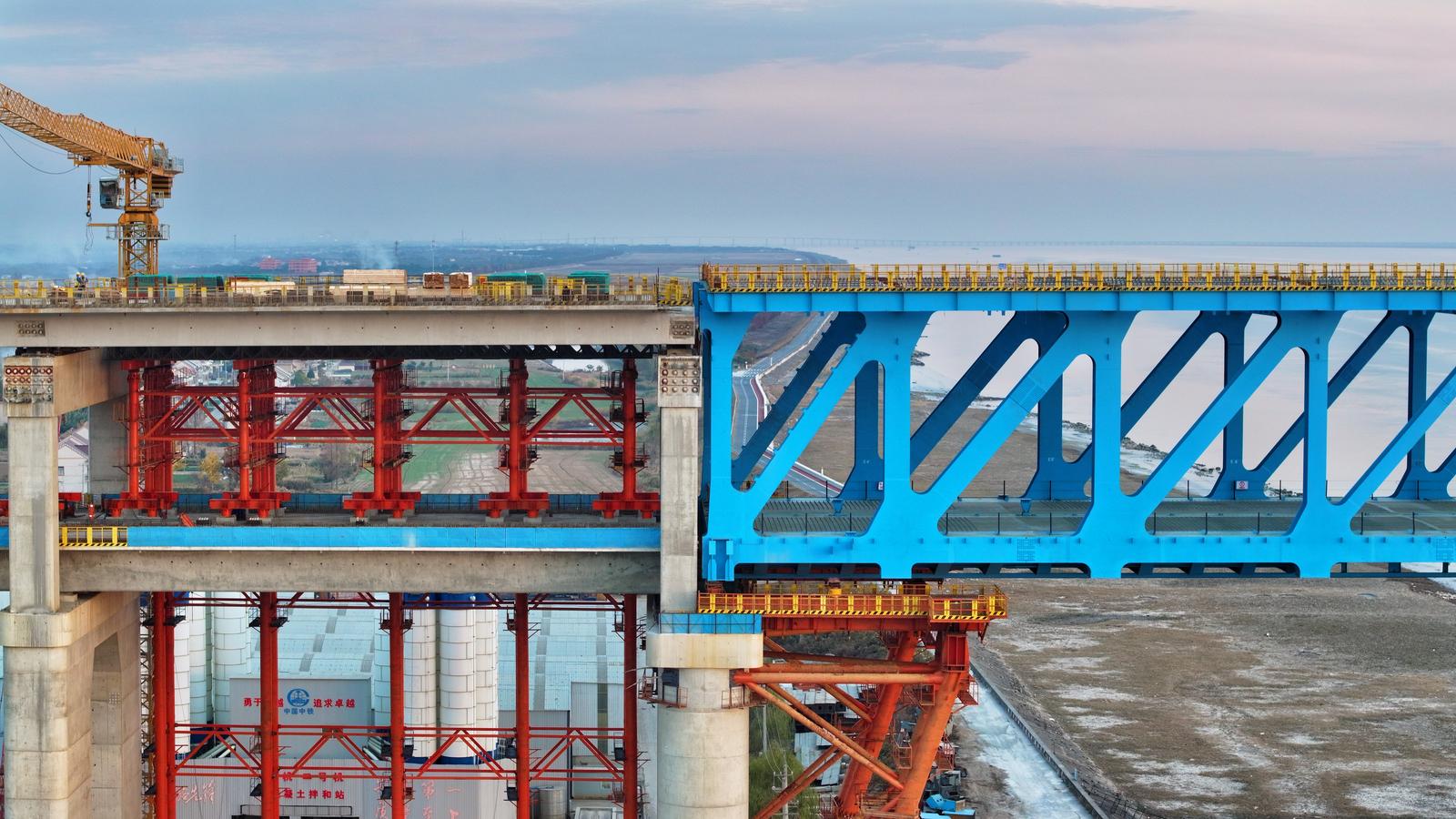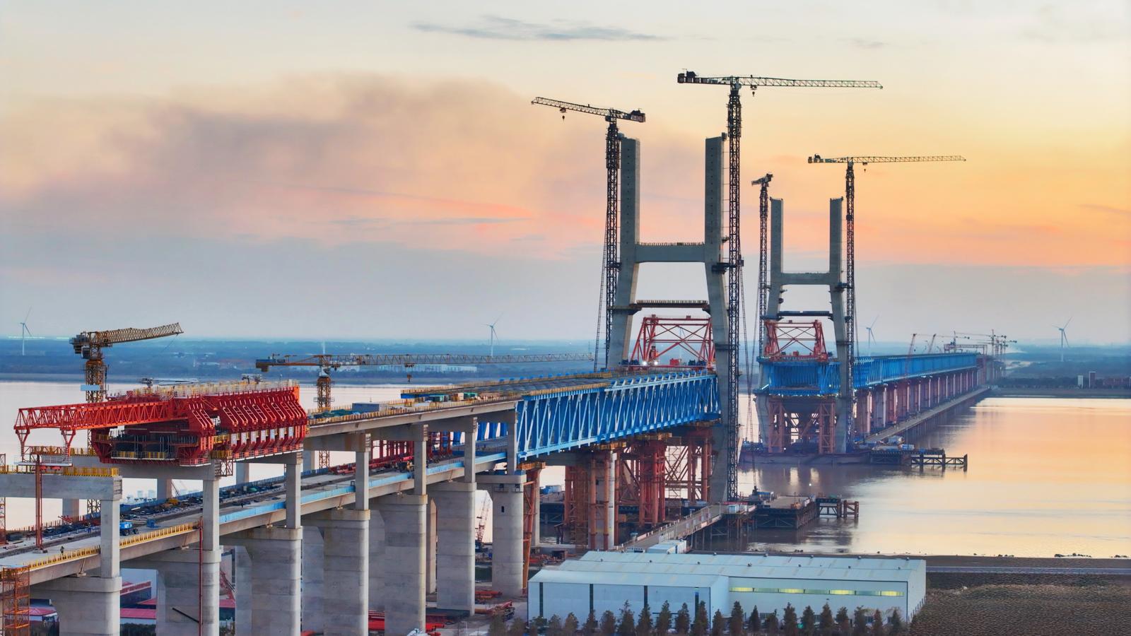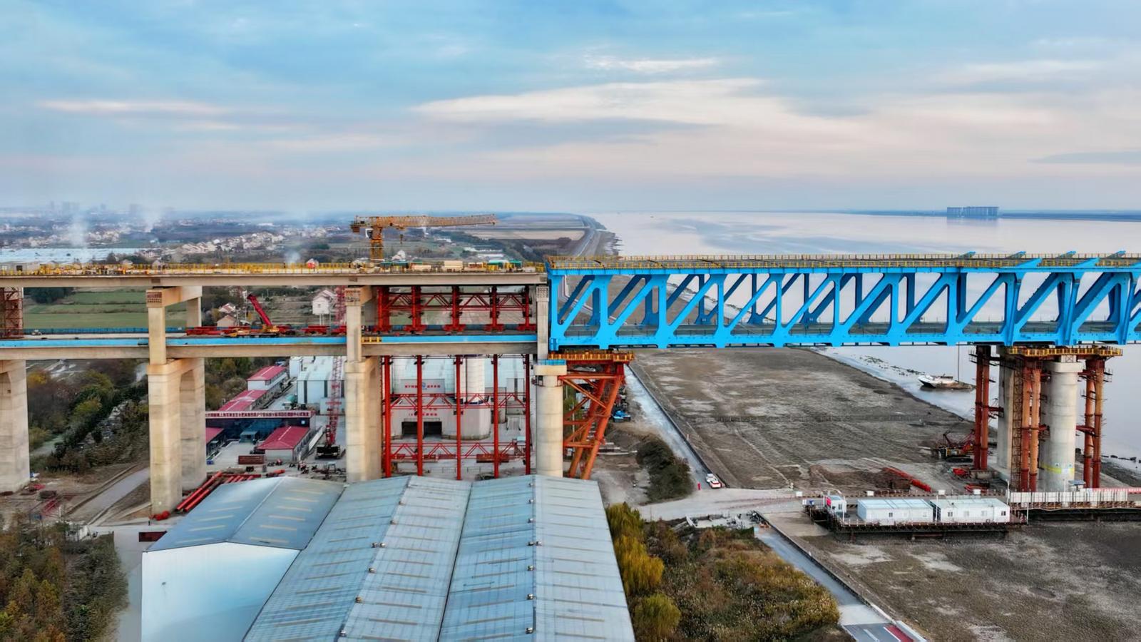 宽阔的长江北支入海口处,沪渝蓉高铁崇启公铁长江大桥蓝色钢桁梁与灰白色北引桥已实现“握手”,后续在钢桁梁落梁后,这条“跃江长龙”将向着主通航孔桥中跨合龙迈进。