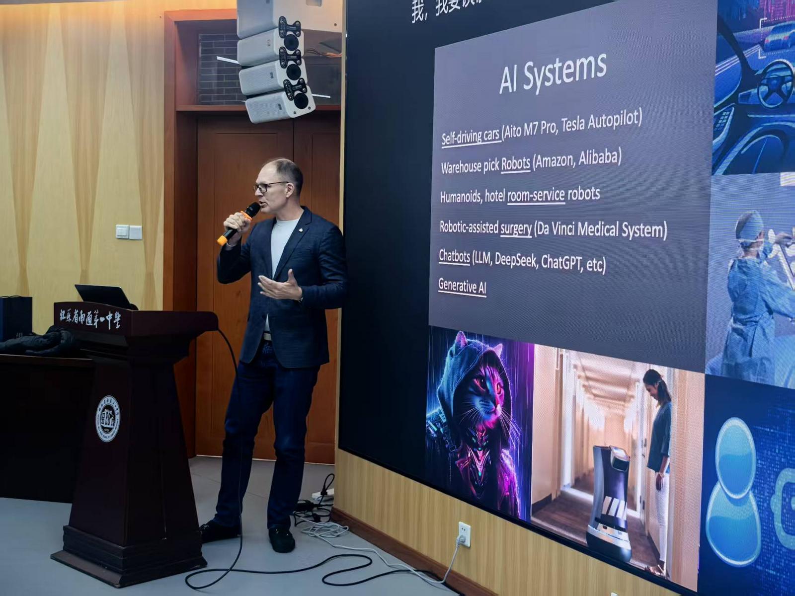 斯特加德·马丁是英国剑桥大学沃尔夫森学院生理学、发展与神经科学系教授,在人工智能与神经科学领域具有深厚的研究背景与丰富的学术经验。这次南通一中之行,他以人工智能与神经科学为题,讲述人工智能如何助力学生学习以及协助工作。
