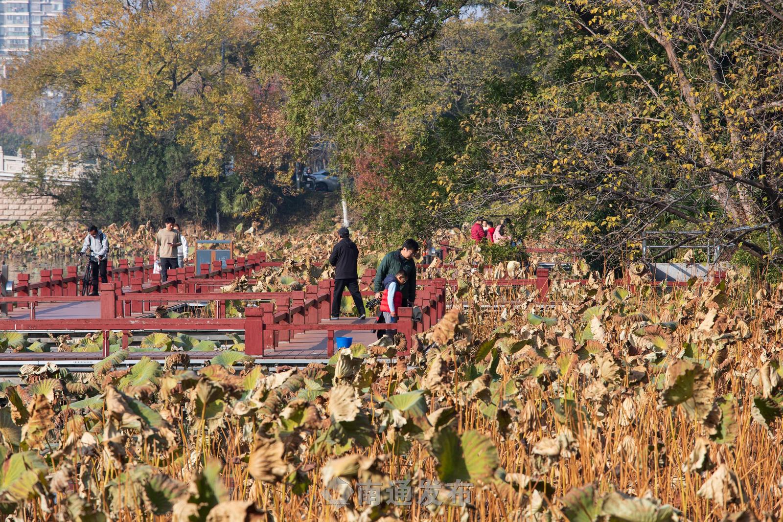 12月初的暖阳倾洒河面,逐渐开始干枯的莲茎或挺立或微倾,蜷缩的荷叶被光线雕琢出清晰的轮廓。阳光透过枝茎间隙,在水面投射出斑驳陆离的光影,为这幅冬荷图增添了生动的韵律。不少市民驻足观赏,用镜头记录下这份属于冬日的静谧之美。