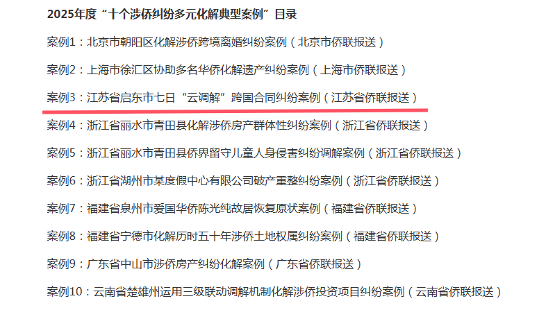 启东市七日“云调解”跨国合同纠纷案例入选2025年度“十个涉侨纠纷多元化解典型案例”