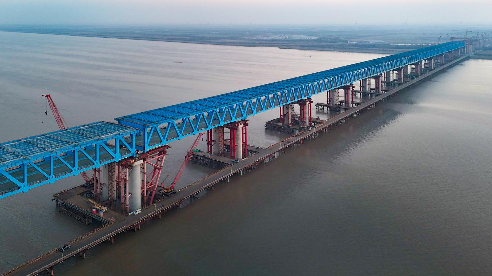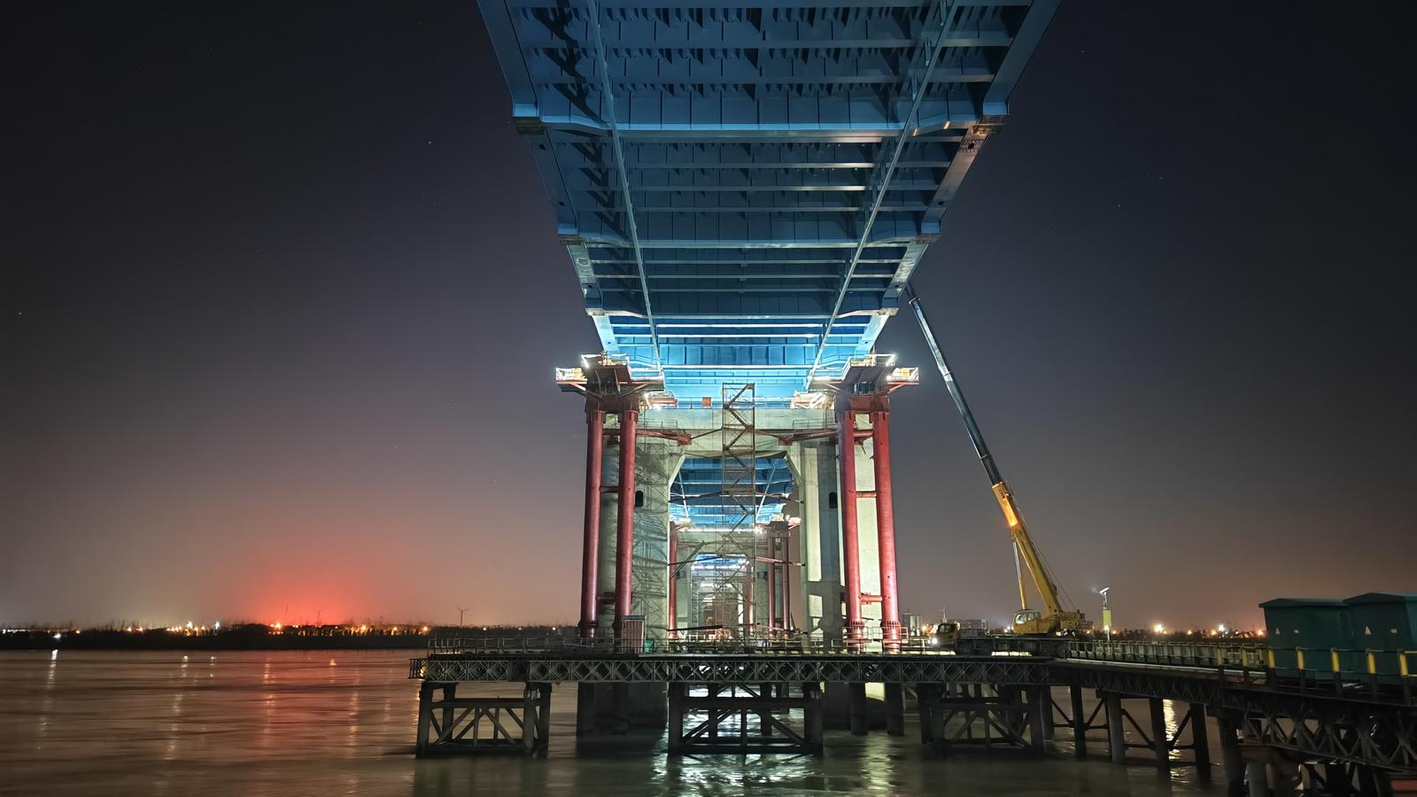 26台大力千斤顶同步精准“划龙舟” 崇启公铁长江大桥完成毫米级钢梁顶推