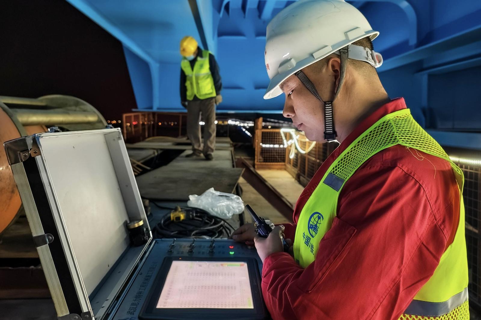 中铁大桥局沪渝蓉项目部一分部副总工程师张晓波说,这次顶推是我国长江上最长、最重的钢梁顶推施工,核心在于极高精度的同步控制。记者在现场看到,26台大推力千斤顶像“划龙舟”一样同步发力,项目团队应用自主研发的智能控制系统,实现对全部顶推设备的集中指挥与实时微调,确保“钢铁巨龙”平稳、精准移动。每轮顶推至最后1米时进行纠偏精调,使偏位控制在10毫米内,保证下一轮起始精度,最终保障千米钢梁以毫米级精度平稳就位。