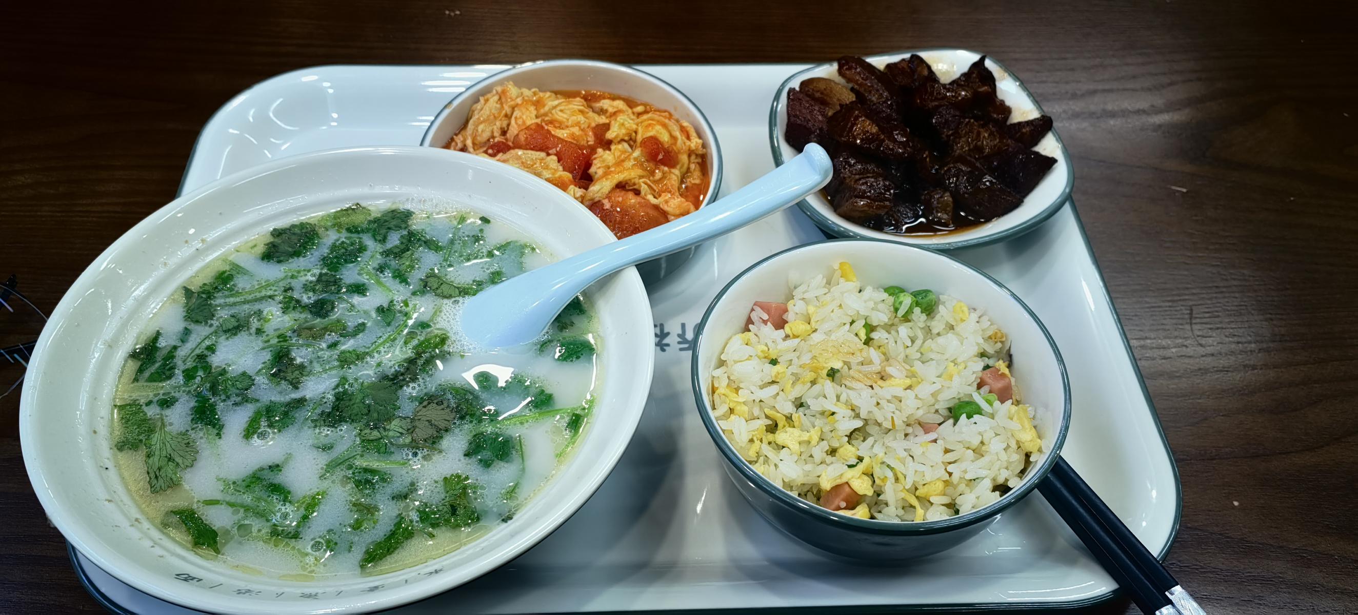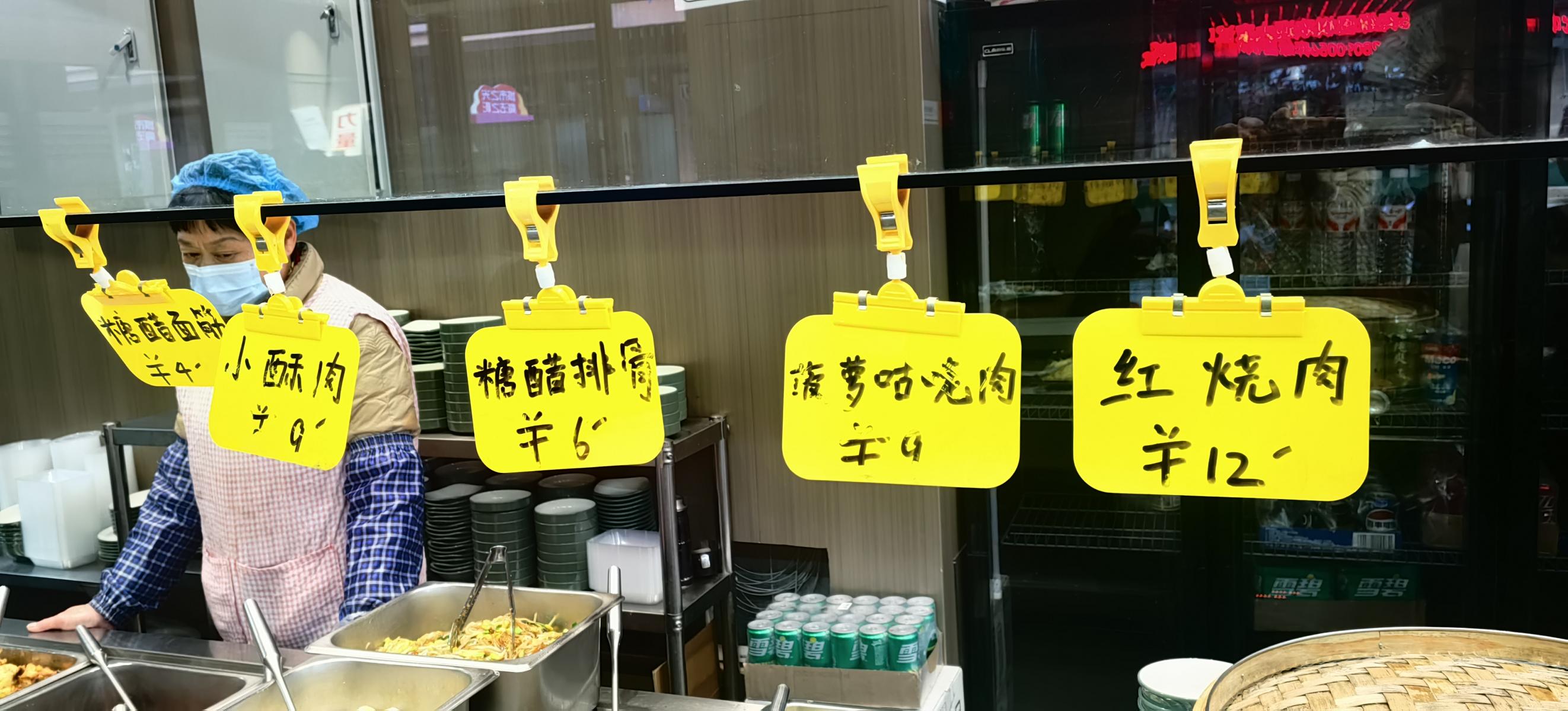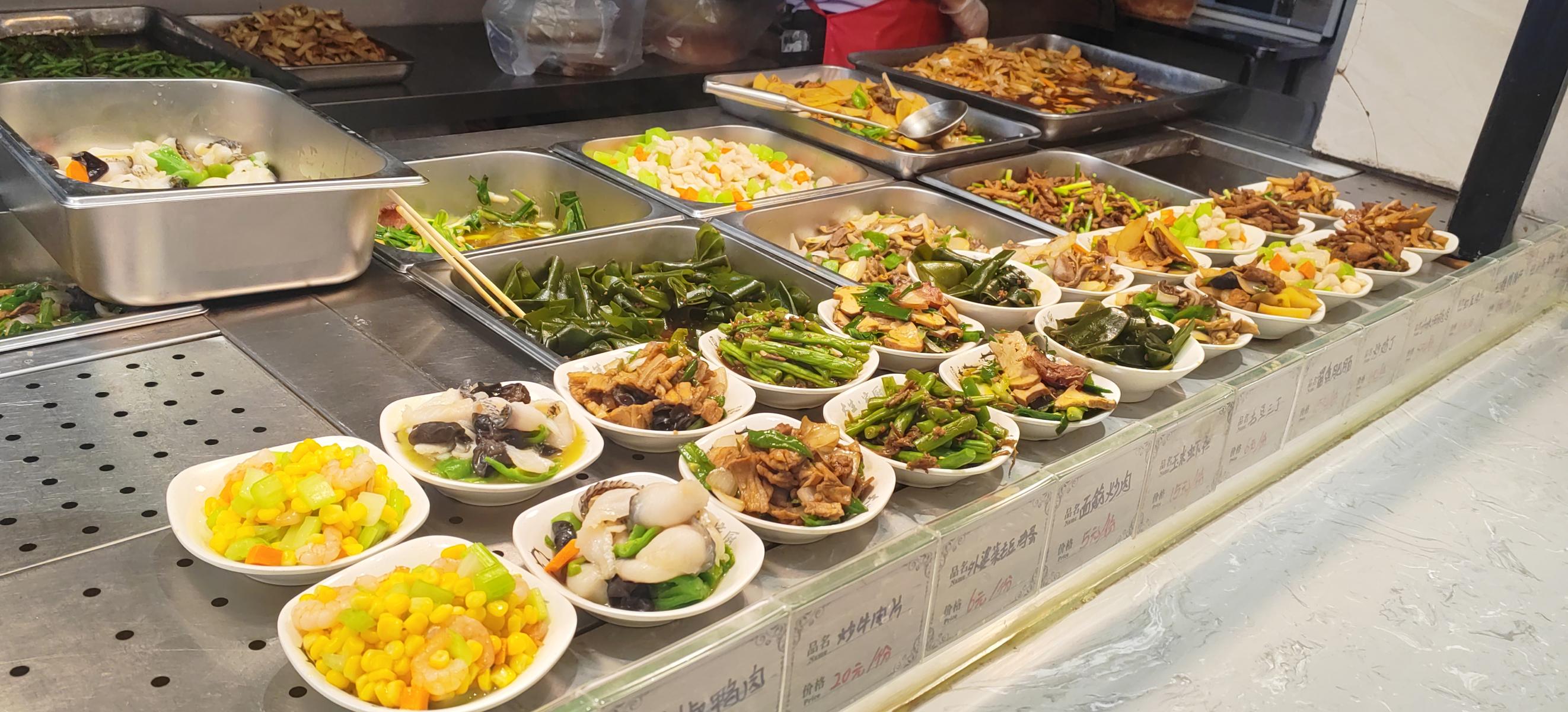 随着午市的到来,这个240多平方米、上下两层的空间渐次坐满。档口陈列着30多种热气腾腾的菜品,价格一目了然:清炒时蔬最低2元,荤菜多在十余元。
