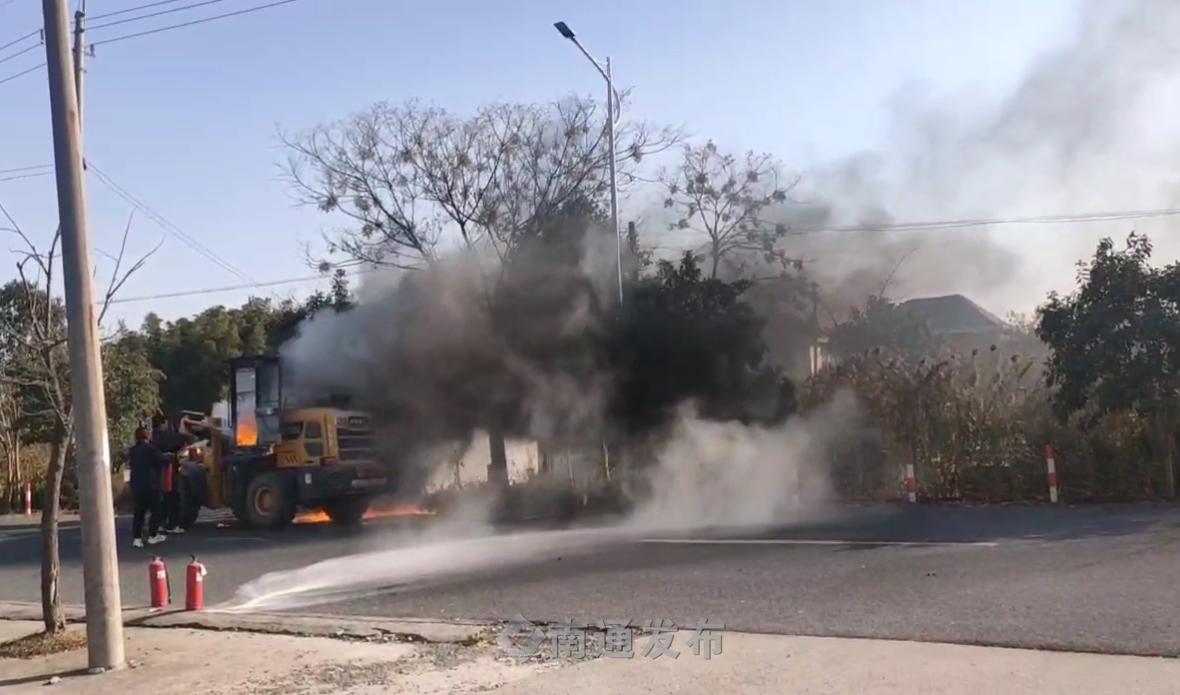 “起火了!快来人啊!”8日下午1时45分,南通飞鹤公交通州骑岸公交回车场外,一辆铲车突然冒起浓烟,火苗不断蹿出。正在休息的628路驾驶员徐成会、王小峰听到呼救,立刻冲向现场。