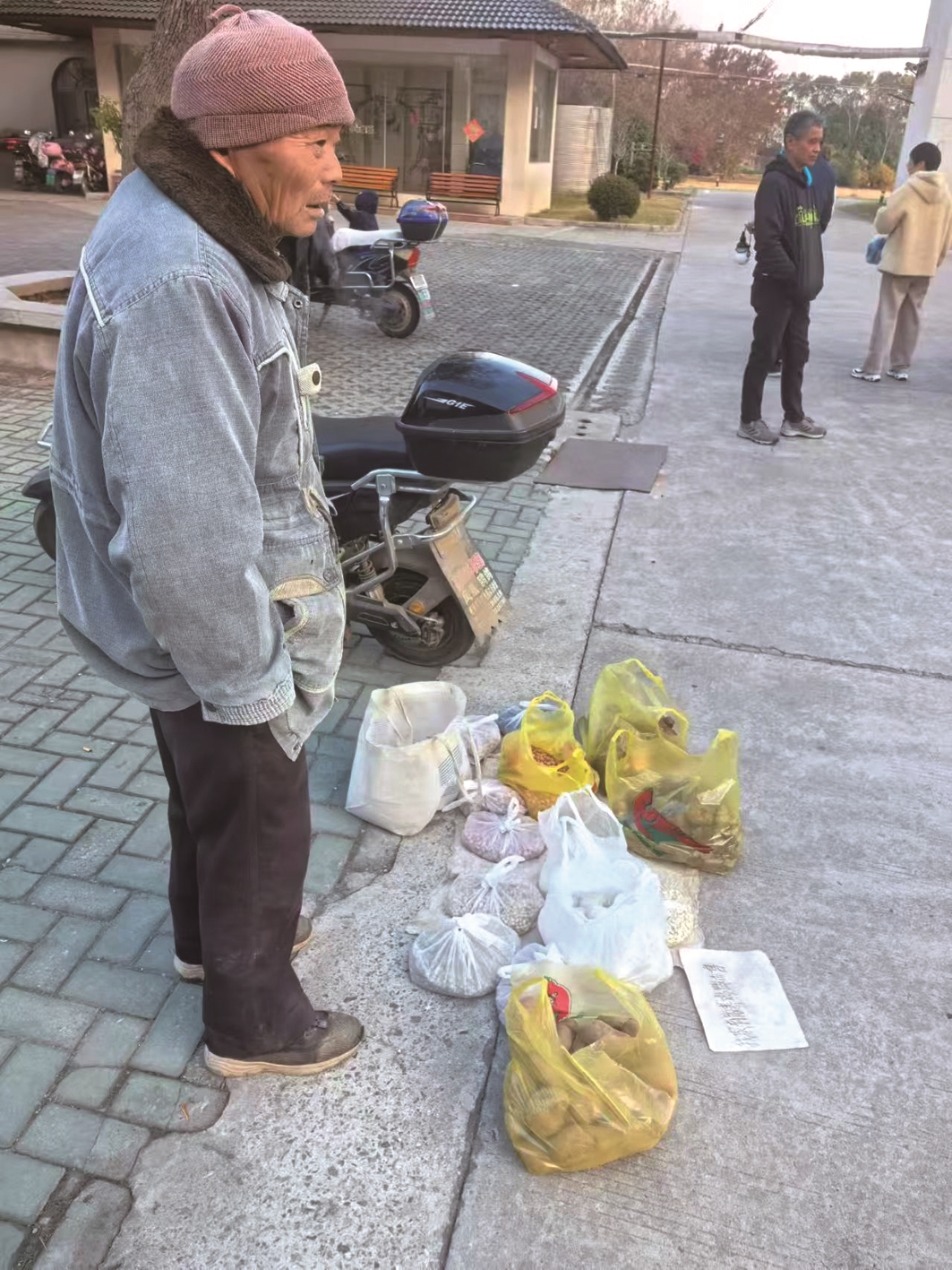 今天两人再次相见,就如同故友了。几名上海游客来问价,老洒让他们猜老人的年纪。知道真实年龄后,一老太嘟囔:“腰板噶挺,脸色噶好,哪能想到大我10岁呢?”一游客看中芋艿,要扫码支付。老人拿不出二维码,生意没做成。老人依旧笑眯眯,站在寒风中耐心等待。