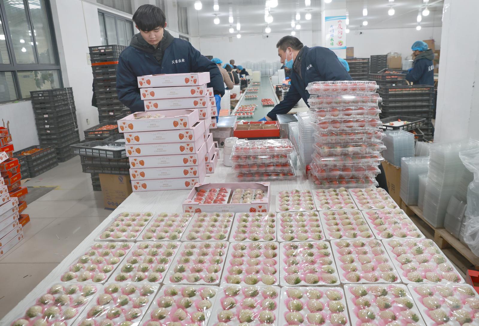 在通州区东社镇的天采果蔬分拨中心,刚从田间采摘的草莓正“躺”进泡沫盒的独立“单间”,等待坐上快车,销往全国各地。