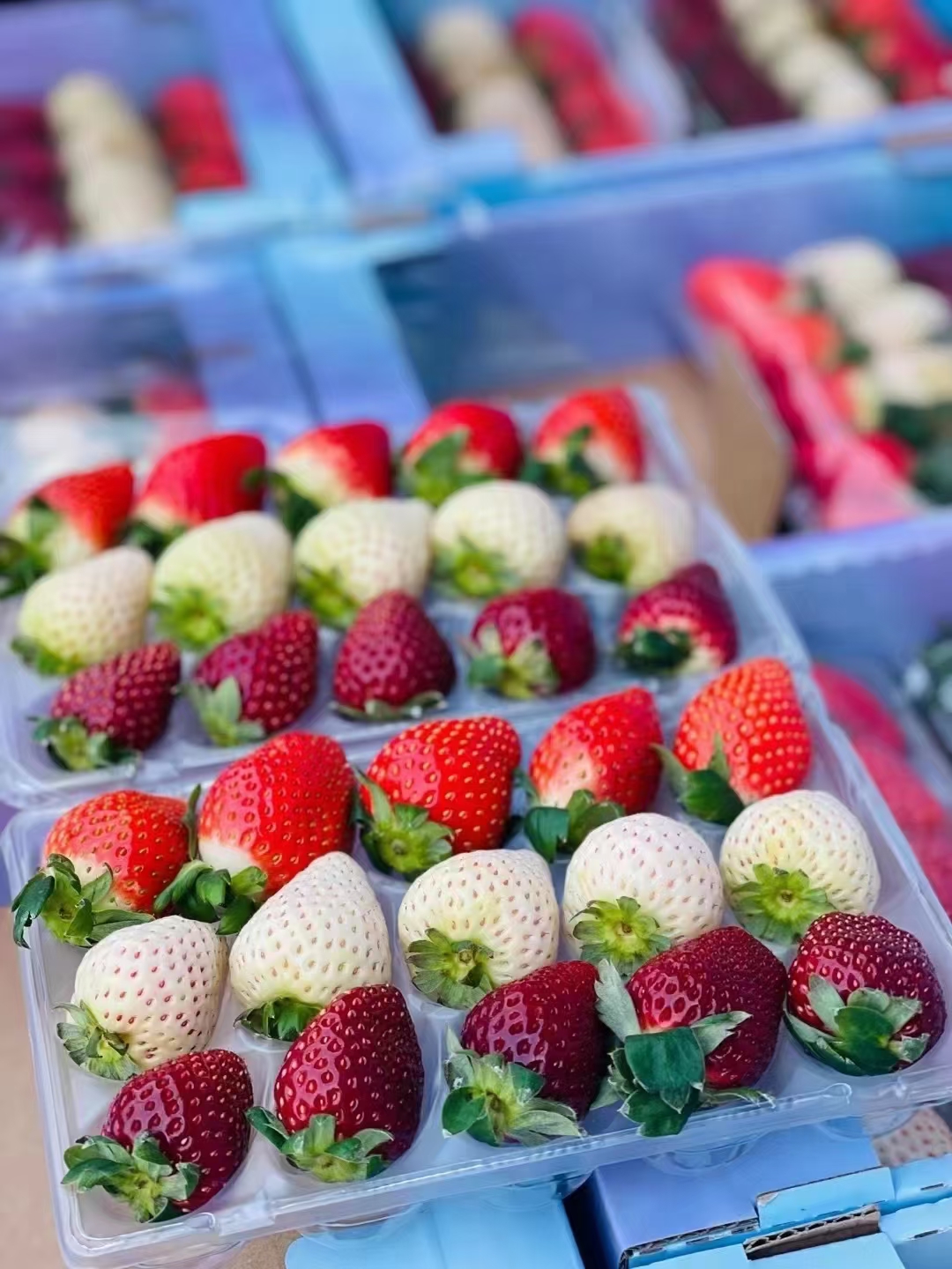 “今年种了50亩草莓,既有隋珠、宁玉、天仙醉等3个早熟品种,也搭配了红颜、白草莓等中晚熟品种,11月初就已抢先上市。”合作社经理张金龙介绍,目前草莓产量尚有限,半个月后将迎来大量上市期,“眼下早熟品种售价约50元/公斤,陆续上市的红颜草莓能卖到90元/公斤,在市场上十分紧俏。”