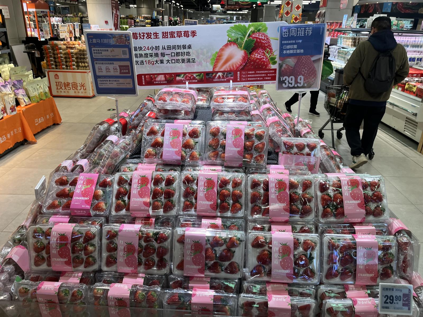 盒马鲜生复悦里店的货架上,一盒盒包装精致、色泽红润的草莓稳稳占据“C位”,货架上方“口感软糯·本地限定基地”的海报格外吸睛。300克盒装红颜草莓mini果标价25.8元,同规格章姬奶油草莓售价39.9元,这两款热销鲜果的供应商,均为南通天采果蔬种植有限公司。