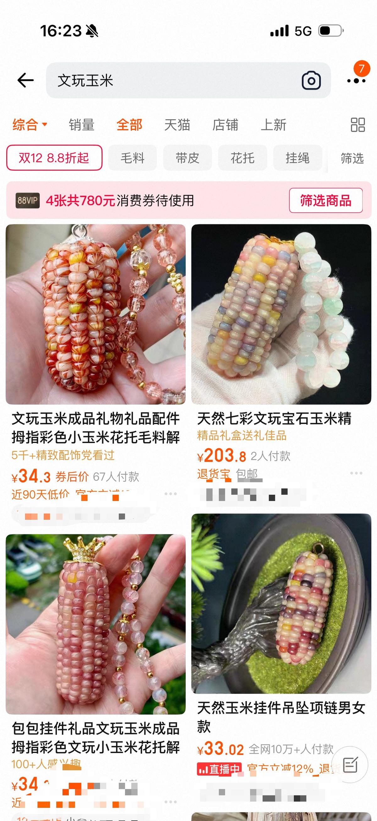 更有创意的是,一些店家还为“文玩玉米”配上美丽的流苏、手镯、珠串,这样一来,高级感更强了,“高大上”的观赏性一下子大幅提升。还有一些店家配上精致的小福袋等寓意吉祥如意的小物件,同样让这些特色鲜明的“文玩玉米”令人爱不释手。