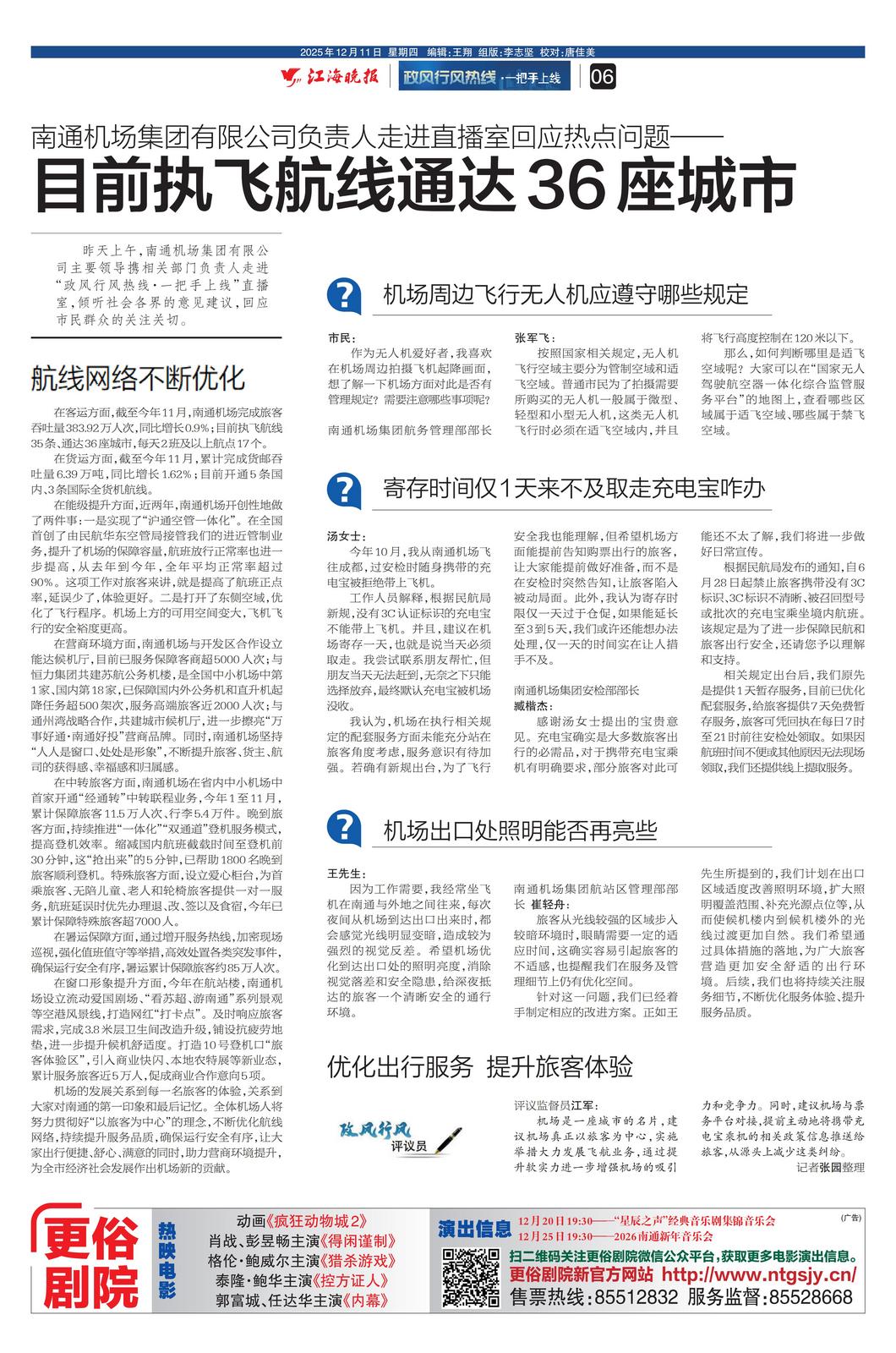 政风行风热线 | 南通机场集团有限公司负责人走进直播室回应热点问题——目前执飞航线通达36座城市