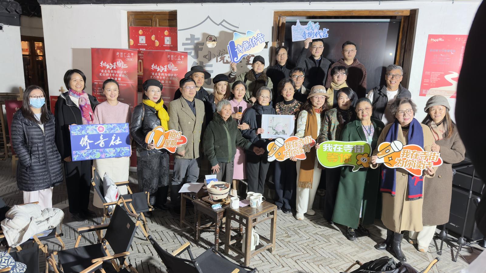 “寺街七点半”是寺街、西南营历史文化街区推出的一项城市文化活化项目,旨在通过夜间文化活动提升街区活力。目前已形成每周七天、主题鲜明的文化菜单。其中,周二由侨音社主动请缨,打造“相约星期二·我在寺街为你读诗”子品牌。迄今为止,侨音社已连续举办三场诗歌诵读会,分别致敬了百岁诗翁沙白、新月派代表诗人卞之琳、革命的文艺战士史白。“我们觉得在千年寺街,以读诗的方式致敬家乡的名人,非常有意义。虽然天气越来越冷,但是我们的内心已经愈发热辣滚烫。我们将继续在这里读下去,用实际行动致敬先贤,点亮寺西。”姚云说。