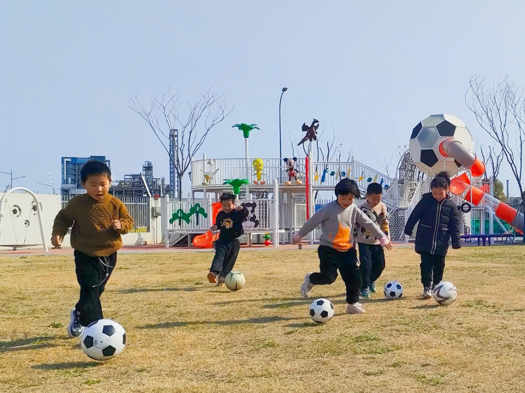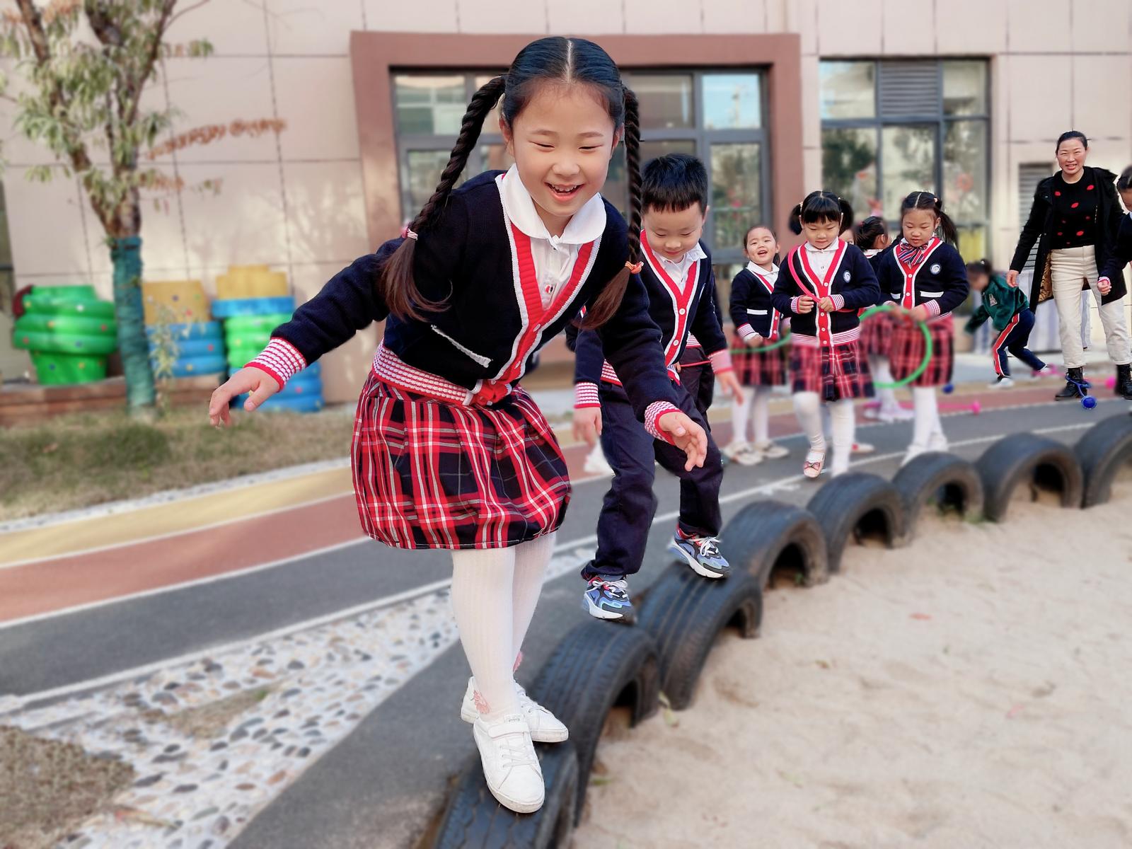 课程融动,趣学相长。幼儿园将运动元素系统融入园本课程体系,做到“玩中学、动中乐”。学校将体能游戏化,在体育游戏中融入走、跑、跳、钻爬、投掷、平衡等基础动作,结合情景故事与角色扮演,提升运动趣味与挑战;主题联动化,结合季节与节日开展“五彩泡泡乐”“小小探险队”“运输接力赛”等特色活动,让运动与认知、审美、社会交往相得益彰;开设足球、啦啦操、跑酷等运动兴趣社团,定期训练,满足个性发展。生活环节中亦渗透微运动,晨间律动操、餐后散步游戏、离园体能小闯关……使运动成为幼儿日常的自然组成部分,强体能、养习惯、育品德。