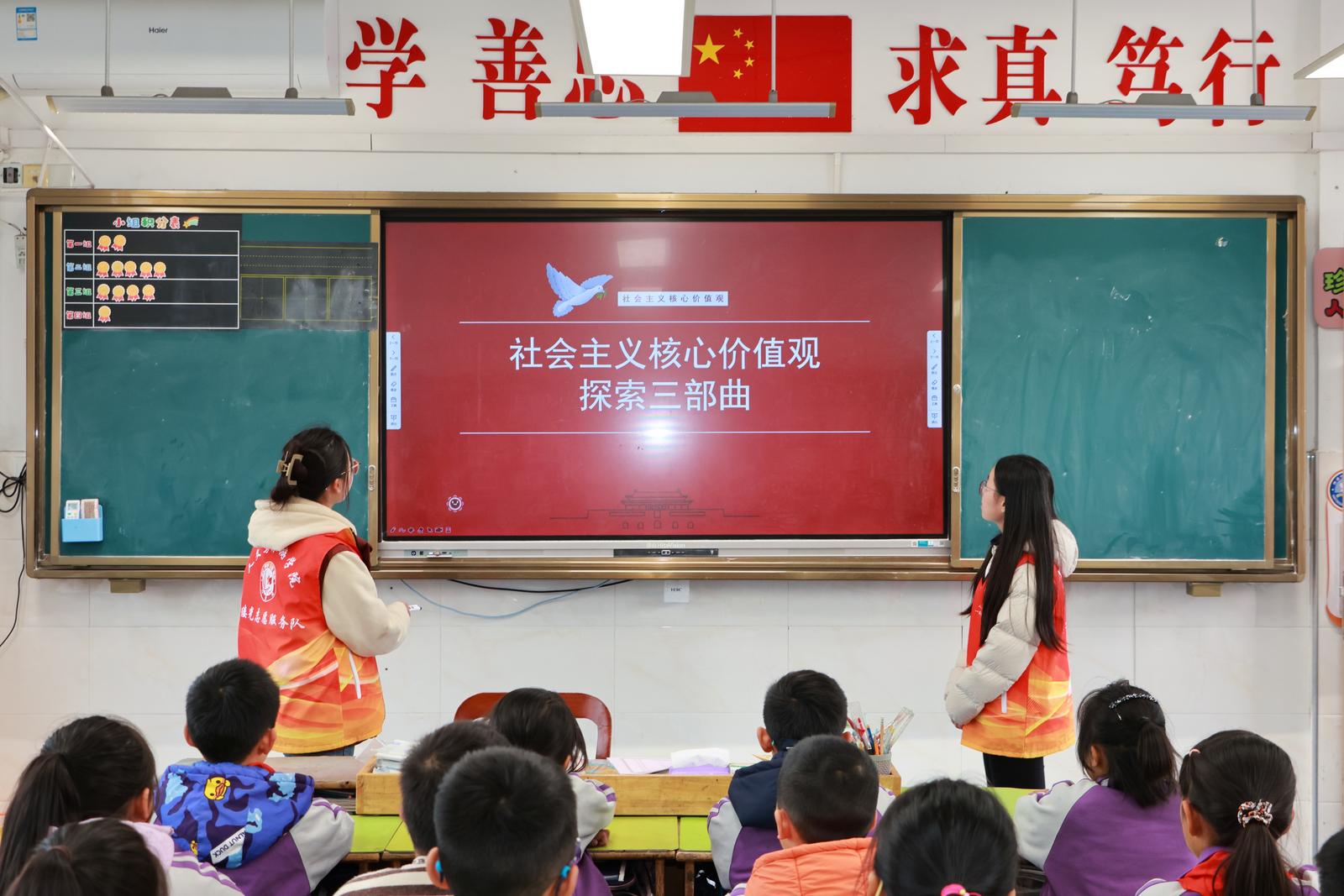 现场互动氛围热烈,小学生们专注听讲、踊跃抢答,将课堂所学与生活实践紧密结合。“老师,我知道!社会主义核心价值观中的‘友善’就是要和同学友好相处,互相帮助。”在互动问答环节,一位同学抢答。这种寓教于乐的志愿服务形式,既契合小学生认知特点,又让爱国主义教育入脑入心。