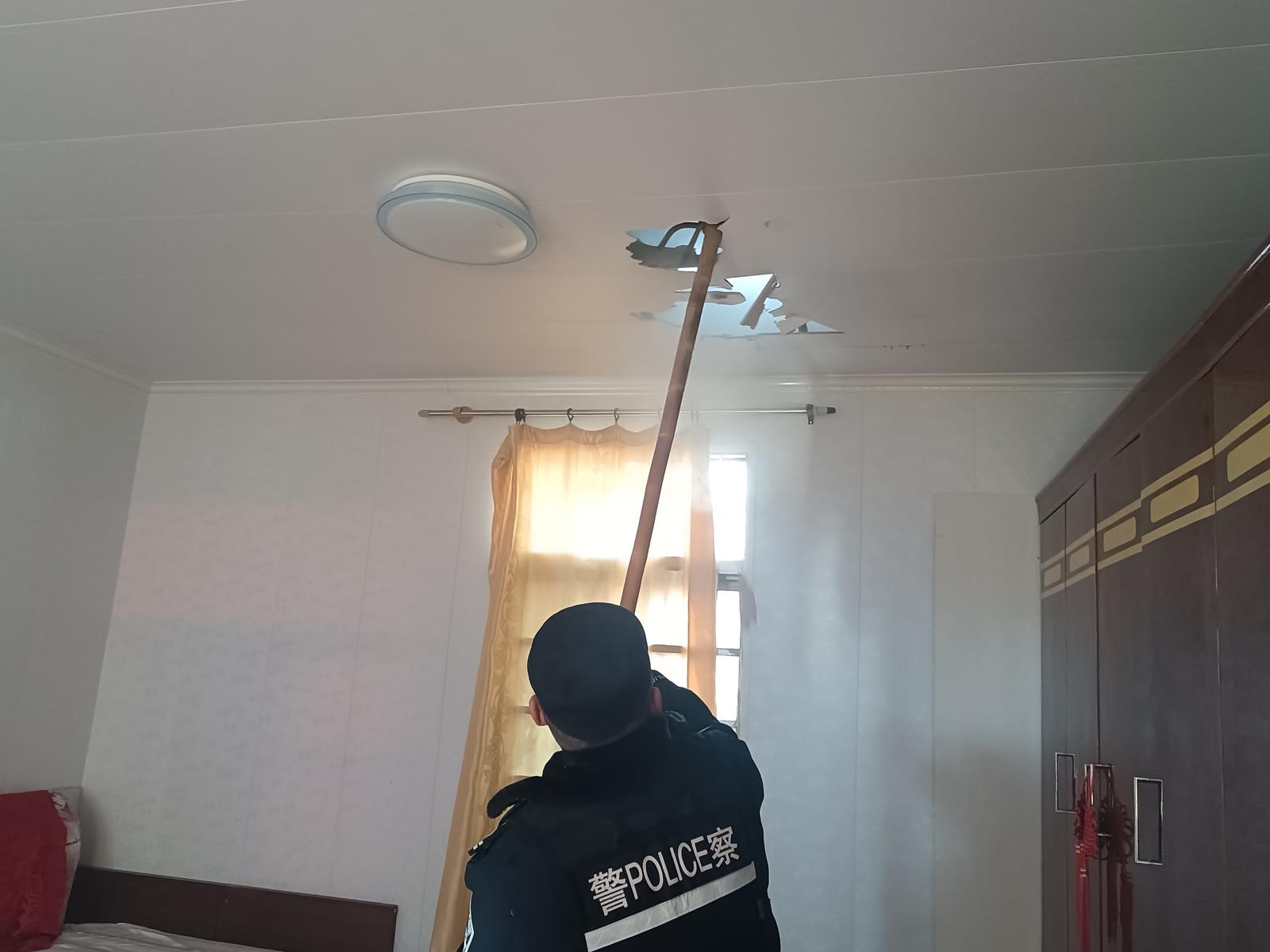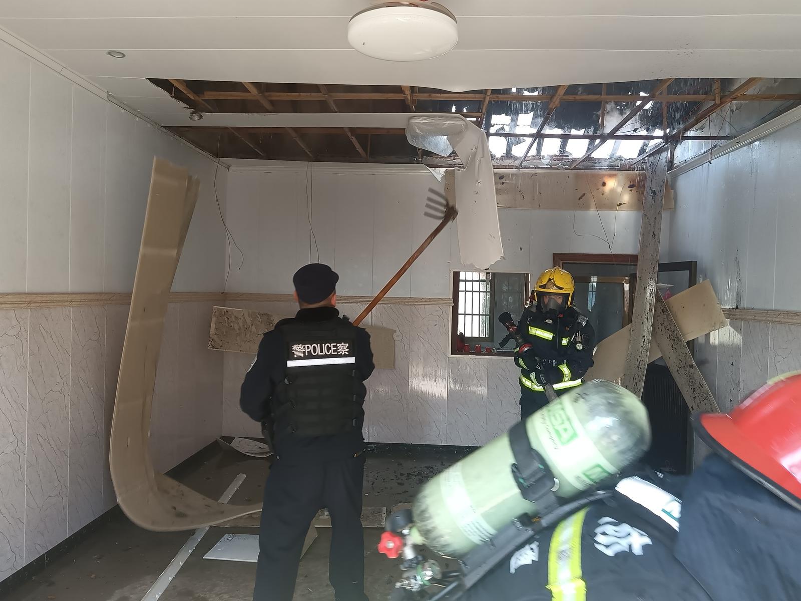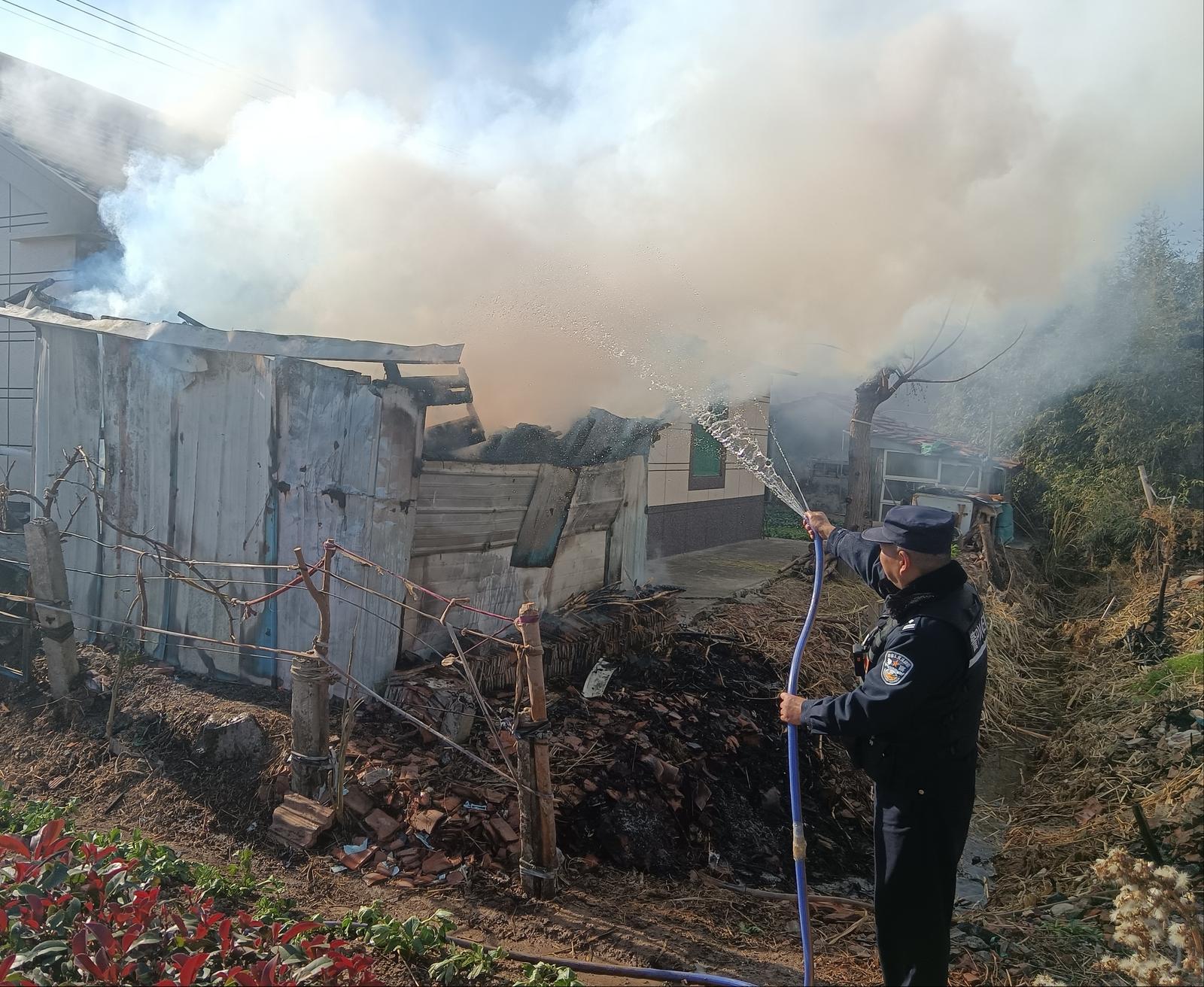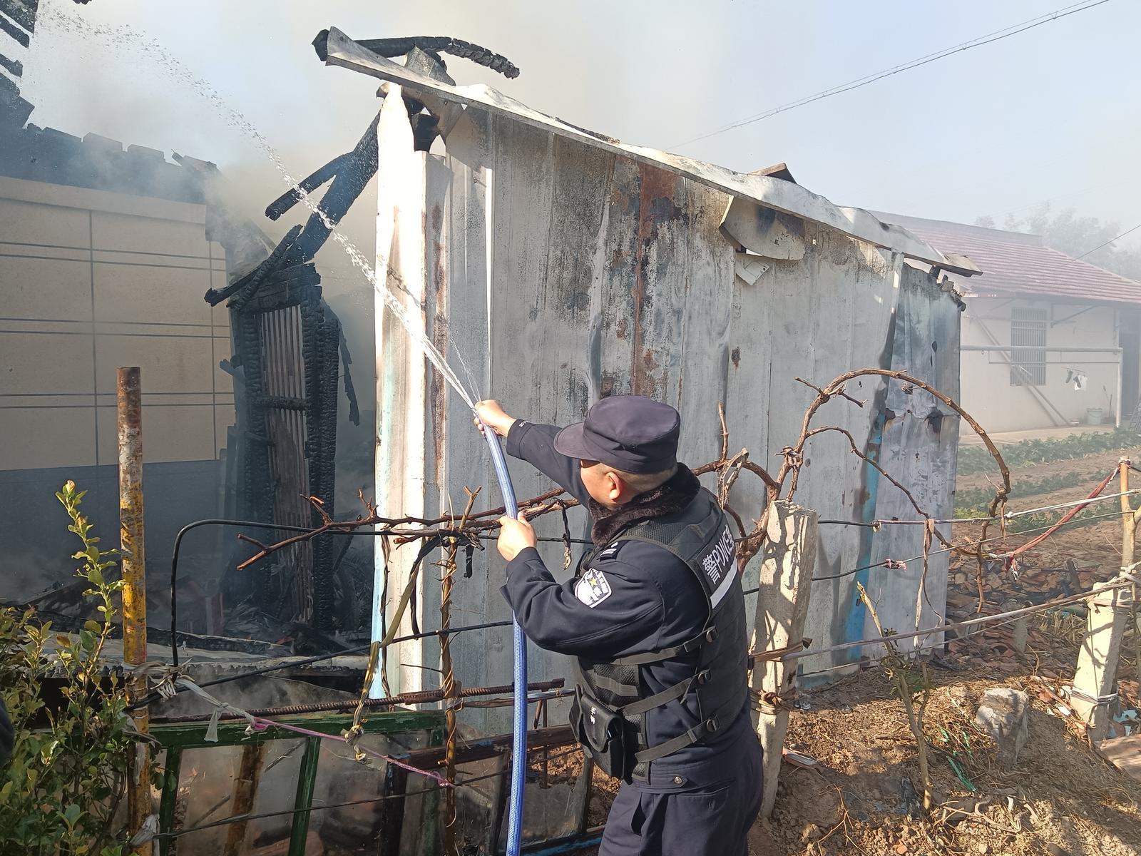 王鲍派出所接警后,值班民警袁金辉和同事携带装备迅速赶赴现场,到达时火势已从简易杂物间蔓延到住房,现场浓烟滚滚,直呛人口鼻,周围邻居已开始自发帮忙救火。袁金辉迅速评估现场情况,一边让同事在确保安全的情况下帮助受灾群众抢搬重要物品,一边自己拿起农用水枪向火源喷射,全力控制住火势,随后赶至的消防人员经过近一小时高压水枪扑救,明火完全扑灭。由于前期救援及时,3间民房主体结构完整,只是其中两间的后半部分屋顶被烧毁坍塌,经济损失被降到最低。