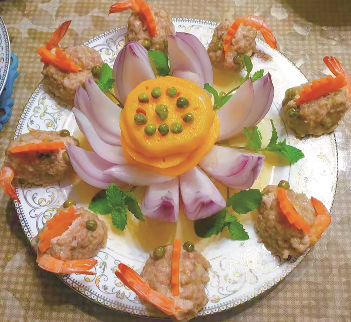 紫的洋葱、黄的南瓜、橙的虾尾、绿的薄荷,诸般色彩,浓淡相宜。寻常食材,一双巧手点化,竟成清雅盘中画。